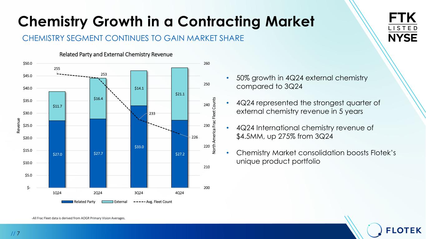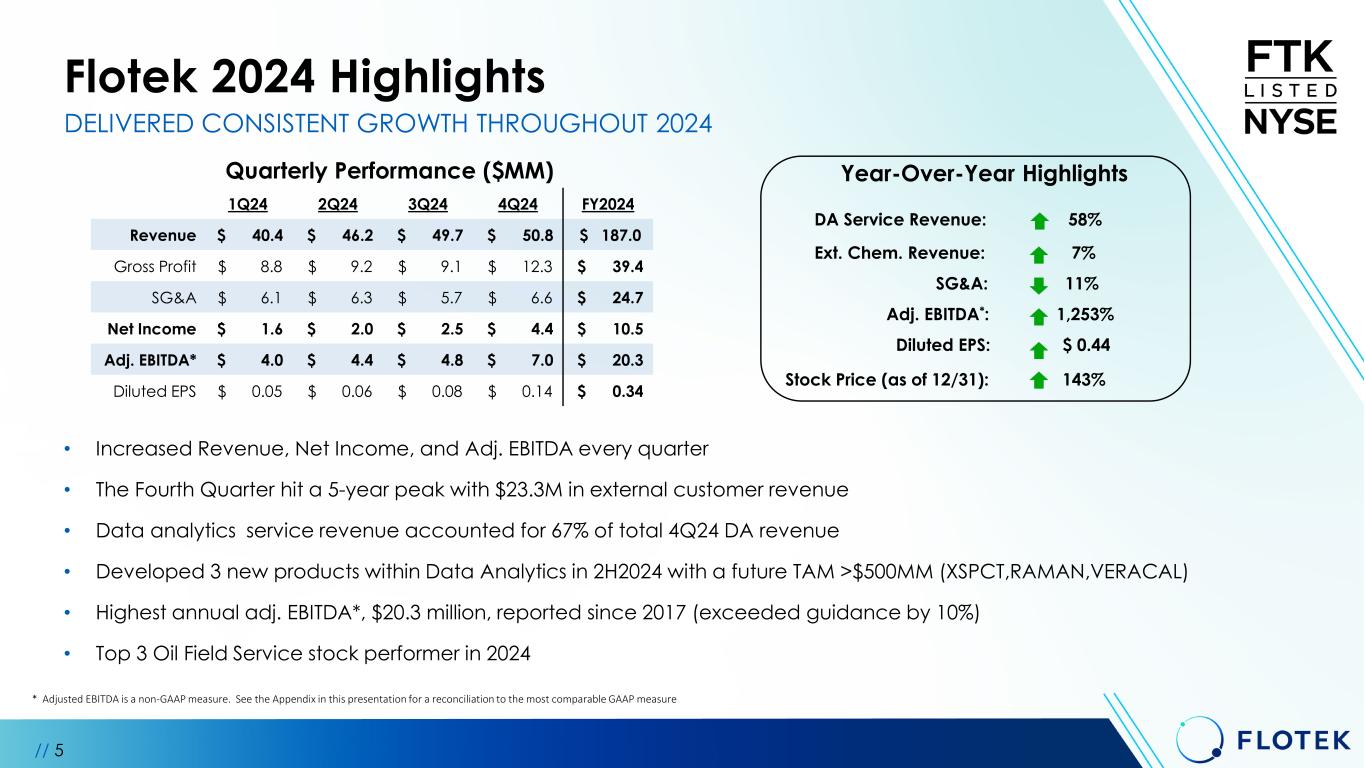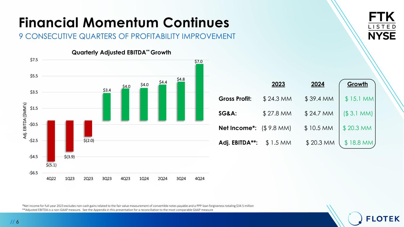 •每季度增加收入、净收入和Adj. EBITDA •第四季度达到5年峰值,外部客户收入为2330万美元•数据分析服务收入占4Q24 DA总收入的67% • 2H2024在Data Analytics内部开发了3个新产品,未来TAM > 500mm(XSPCT、RAMAN、VERACAL)•最高年度adj. EBITDA*,2030万美元,报告了自2017年以来(超出指引10%)• 2024年1Q24 2Q24 3Q24 4Q24 FY2024收入$ 40.4 $ 46.2 $ 49.7 $ 50.8 $ 187.0毛利润$ 8.8 $ 9.2 $ 9.1 $ 12.3 $ 39.4 SG & A $ 6.1 $ 6.3 $ 5.7 $ 6.6 $ 24.7净收入$ 1.6 $ 2.0$ 2.5 $ 4.4 $ 10.5调整后EBITDA*$ 4.0 $ 4.4 $ 4.8 $ 7.0 $ 20.3摊薄后每股收益$ 0.05 $ 0.06 $ 0.08 $ 0.14 $ 0.34 Flotek 2024亮点//5实现了贯穿始终的增长2024*调整后EBITDA是一种非GAAP衡量标准。请参阅本演示文稿中的附录,了解与最具可比性的GAAP衡量标准季度业绩(百万美元)的对账同比亮点DA服务收入:58% Ext. Chem。收入:7% SG & A:11% Adj. EBITDA*:1,253%摊薄EPS:0.44美元股价(截至12/31):143%