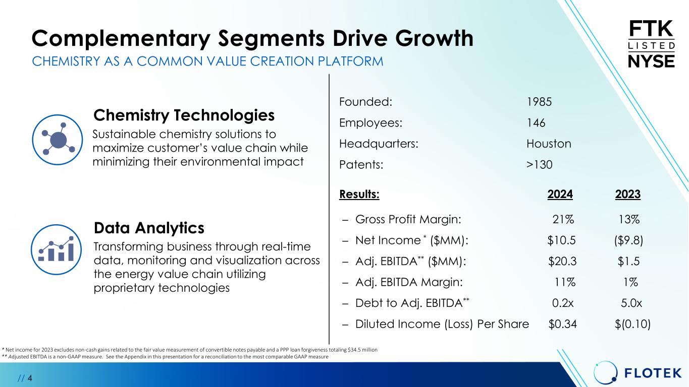 互补的细分市场推动增长//4种可持续化学解决方案,以最大限度地利用客户的价值链,同时通过实时数据最大限度地减少其环境影响转化业务,利用专有技术监测和可视化整个能源价值链Chemistry Technologies Data Analytics CHEMISTRY as a Common Value Creation Platform成立时间:1985员工:146总部:休斯顿专利:> 130结果:20242023 –毛利率:21% 13% –净收入*($ mm):$ 10.5($ 9.8)–调整后EBITDA**($ mm):$ 20.3 $ 1.5 – Adj. EBITDA Margin:11% 1% – Debt to Adj. EBITDA**0.2x 5.0x –每股摊薄收益(亏损)$ 0.34 $(0.10)*2023年净收益不包括与应付可转换票据公允价值计量相关的非现金收益以及总额为3450万美元的PPP贷款减免**调整后EBITDA是一种非GAAP衡量标准。请参阅本演示文稿中的附录,了解与最具可比性的GAAP衡量标准的对账情况