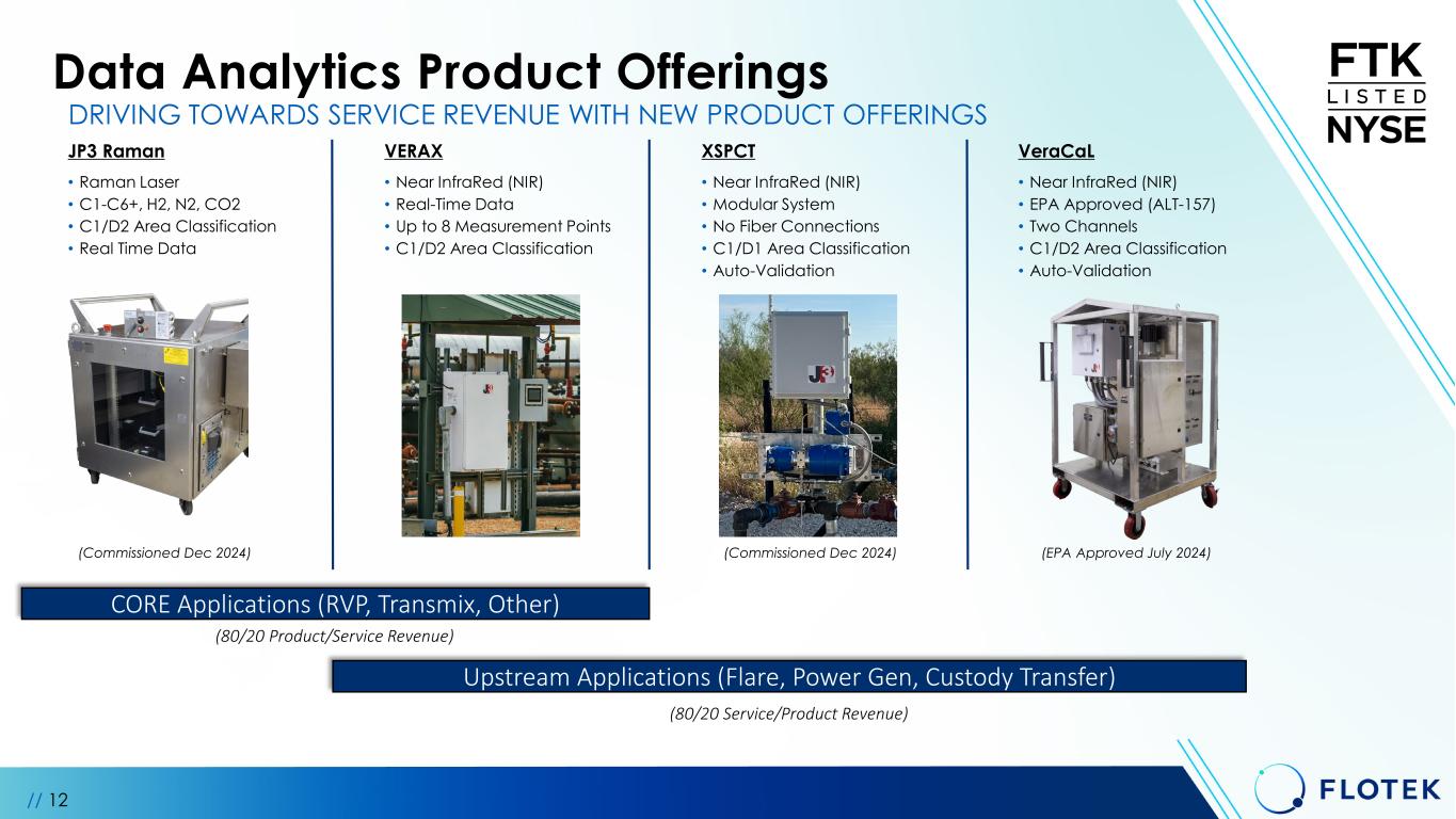 数据分析产品提供JP3拉曼•拉曼激光• C1-C6 +、H2、N2、CO2 • C1/D2区域分类•实时数据VERAX •近红外(NIR)•实时数据•多达8个测量点• C1/D2区域分类XSPCT •近红外(NIR)•模块化系统•无光纤连接• C1/D1区域分类•自动验证VeraCAL •近红外(NIR)• EPA批准(ALT-157)•两个通道• C1/D2区域分类•自动验证核心应用(RVP、Transmix、其他)上游应用(Flare、Power Gen、Custody Transfer)(80/20产品/服务收入)(80/20服务/产品收入)以新产品提供推动服务收入//12(2024年12月委托)(2024年12月委托)(EPA 2024年7月批准)