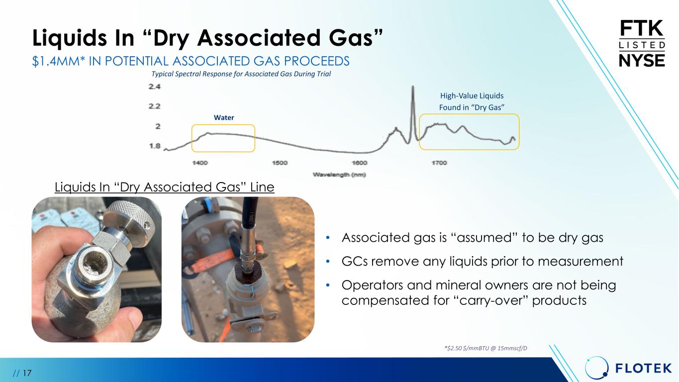 “干伴生气体”中的液体//17美元1.4mm*潜在关联气体收益“干气”中发现的高值液体试验用水期间关联气体的典型光谱响应•关联气体被“假定”为干气• GC在测量前去除任何液体•经营者和矿主未因“结转”产品“干关联气体”中的液体获得补偿*$ 2.50 $/mmBTU @ 15mmscf/d