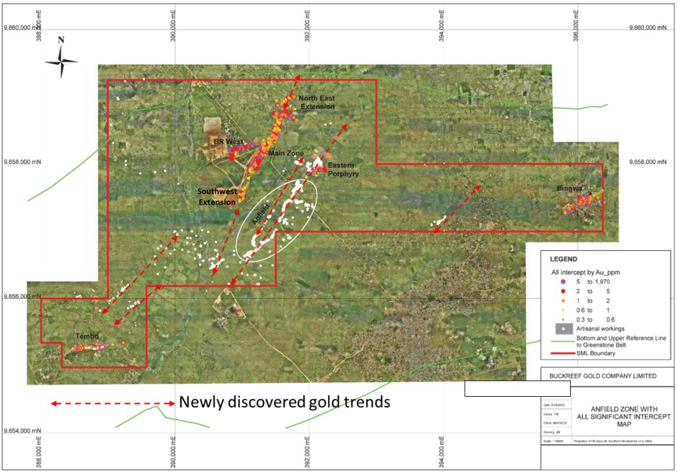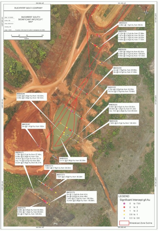 本MD & A中总结的结果来自Buckreef Main Zone NEE前景。该前景是已知的Buckreef主带的延伸。这些截获证实,已知的Buckreef主要矿床向东北方向的连续性超过200米。此处报告的交叉口为井下长度,可能不代表真实宽度,但真实宽度估计在长度的50%-60 %之间。