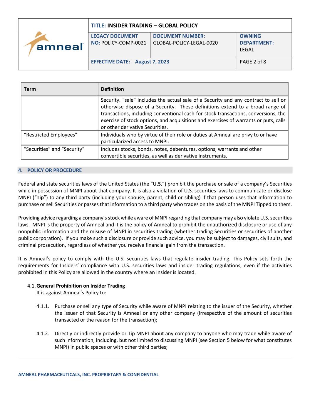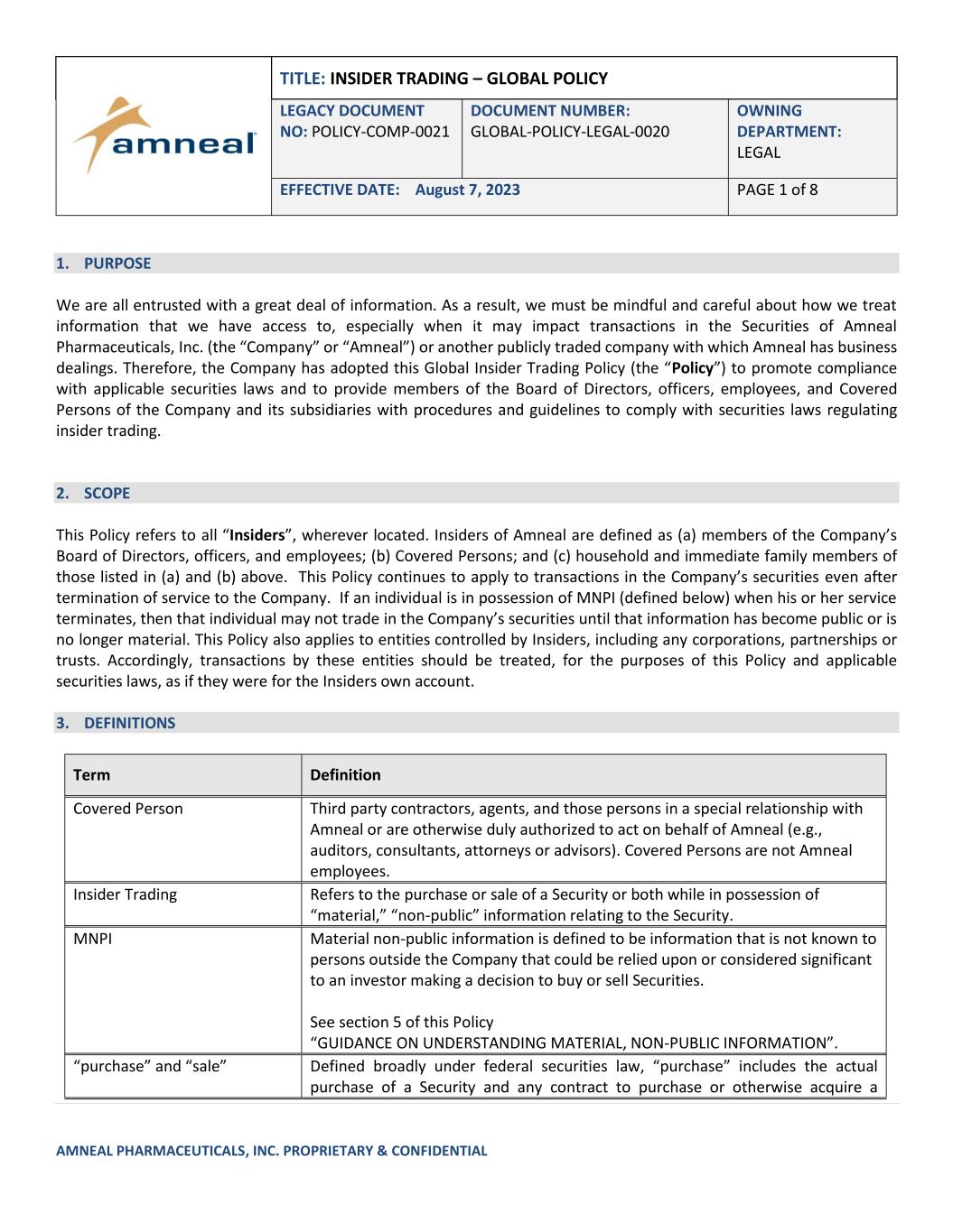 标题:内幕交易–全球政策遗产文件编号:POLICY-COMP-0021文件编号:GLOBAL-POLICY-LEGAL-0020所有权部门:法律生效日期:2023年8月7日第1页,共8页AMNEAL Pharmaceuticals,INC。专有&机密1。目的我们都被托付了大量的信息。因此,我们必须谨慎对待我们如何看待我们可以获得的信息,尤其是当它可能影响到Amneal Pharmaceuticals, Inc.(“公司”或“Amneal”)或与Amneal有业务往来的另一家上市公司的证券交易时。因此,公司已采纳此全球内幕交易政策(“政策”),以促进遵守适用的证券法,并为公司及其附属公司的董事会成员、高级职员、雇员和涵盖人员提供程序和指南,以遵守规范内幕交易的证券法。2.范围这一政策指的是所有“内部人士”,无论位于何处。Amneal的内部人被定义为(a)公司董事会成员、高级职员和雇员;(b)被覆盖人员;(c)上述(a)和(b)中所列人员的家庭和直系亲属。即使在终止向公司提供服务后,该政策仍继续适用于公司证券的交易。如果个人在服务终止时拥有MNPI(定义见下文),那么该个人在该信息公开或不再重要之前不得交易公司的证券。本政策也适用于由内部人控制的实体,包括任何公司、合伙企业或信托。因此,就本政策和适用的证券法而言,这些实体的交易应被视为为内部人自己的账户。3.定义术语定义涵盖的人第三方承包商、代理人以及与Amneal有特殊关系或以其他方式被正式授权代表Amneal行事的人(例如审计师、顾问、律师或顾问)。覆盖人员不是Amneal员工。内幕交易是指在掌握与该证券有关的“重大”、“非公开”信息的情况下,购买或出售证券或两者兼而有之。MNPI Material非公开信息被定义为公司以外的人不知道的、可能依赖于或被认为对作出买卖证券决定的投资者具有重要意义的信息。见本政策第五节“关于理解材料、非公开信息的指导”。“购买”和“出售”根据联邦证券法的广义定义,“购买”包括实际购买证券以及购买或以其他方式获得