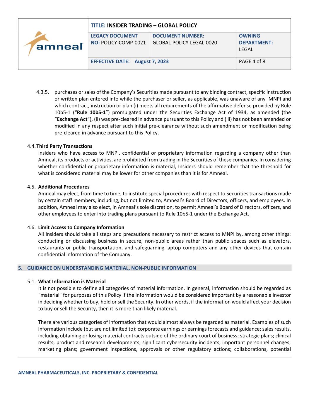 标题:内幕交易–全球政策遗产文件编号:POLICY-COMP-0021文件编号:GLOBAL-POLICY-LEGAL-0020所有权部门:法律生效日期:2023年8月7日第4页,共8页AMNEAL Pharmaceuticals,INC。专有和机密4.3.5.在买方或卖方(如适用)不知道任何MNPI且该合同、指示或计划(i)符合根据经修订的1934年证券交易法(“交易法”)颁布的规则10b5-1(“规则10b5-1”)提供的肯定性抗辩的所有要求时,根据订立的任何具有约束力的合同、特定指示或书面计划购买或出售公司证券,(ii)已根据本政策提前预结清,及(iii)在该初步预结清后并无在任何方面作出修订或修改,而该等修订或修改并无根据本政策提前预结清。4.4.第三方交易内幕人士如有机会获得有关Amneal、其产品或活动以外的公司的MNPI、机密或专有信息,则禁止在这些公司的证券中进行交易。在考虑机密或专有信息是否重要时,内部人士应该记住,其他公司被视为重要信息的门槛可能比Amneal更低。4.5.附加程序Amneal可能会不时选择就某些工作人员进行的证券交易制定特别程序,包括但不限于Amneal的董事会、高级职员和雇员。此外,Amneal还可以全权酌情选择允许Amneal的董事会、高级管理人员和其他员工根据《交易法》规则10b5-1订立交易计划。4.6.限制访问公司信息所有内部人士应采取一切必要步骤和预防措施,限制访问MNPI,其中包括:在安全、非公共区域而非公共空间(如电梯、餐厅或公共交通工具)开展或讨论业务,并保护笔记本电脑和任何其他包含公司机密信息的设备。5.关于理解材料的指导意见,非公开信息5.1。什么信息是材料不可能对所有类别的材料信息都下定义。一般来说,如果合理的投资者在决定是否购买、持有或出售该证券时认为该信息很重要,则就本政策而言,该信息应被视为“重要的”信息。换句话说,如果这些信息会影响你购买或出售证券的决定,那么它很可能是重要的。有各种各样的信息,几乎总是被认为是实质性的。此类信息的例子包括(但不限于):企业收益或盈利预测和指导;销售结果,包括在普通商业法院之外获得或失去重要合同;战略计划;临床结果;产品和研究发展;重大网络安全事件;重要人事变动;营销计划;政府检查、批准或其他监管行动;合作、潜在