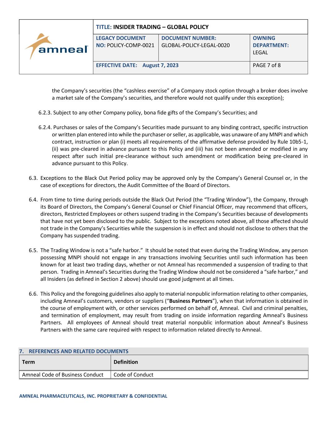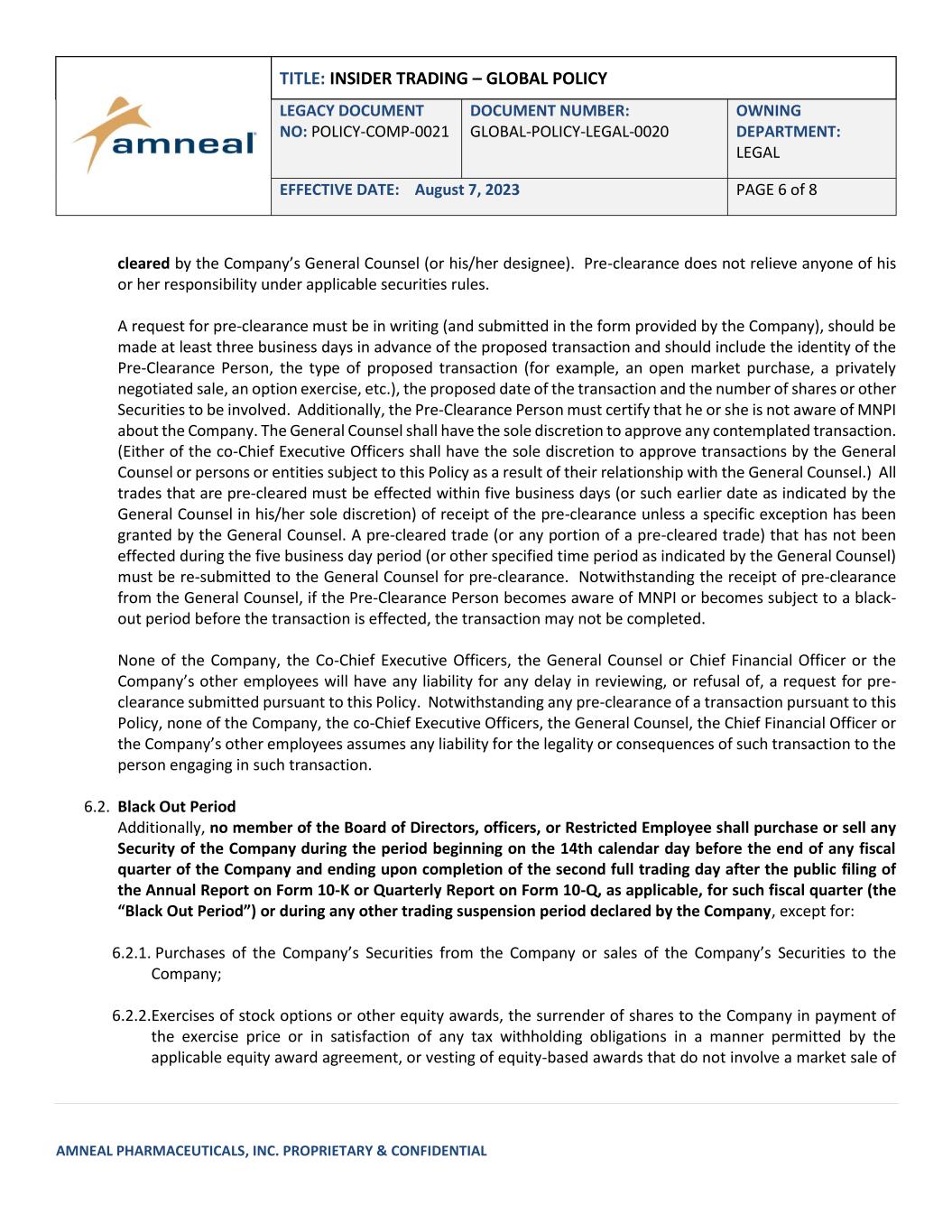 标题:内幕交易–全球政策遗产文件编号:POLICY-COMP-0021文件编号:GLOBAL-POLICY-LEGAL-0020所有权部门:法律生效日期:2023年8月7日第6页,共8页AMNEAL Pharmaceuticals,INC。Proprietary & Confidential由公司总法律顾问(或其指定人员)批准。根据适用的证券规则,预先清算并不解除任何人的责任。预先许可请求必须是书面的(并以公司提供的表格提交),应在拟议交易至少三个工作日前提出,并应包括预先许可人的身份、拟议交易的类型(例如,公开市场购买、私下协商出售、期权行使等)、拟议交易的日期以及所涉及的股份或其他证券的数量。此外,预清算人必须证明他或她不知道有关公司的MNPI。总法律顾问应拥有批准任何预期交易的唯一酌处权。(联席首席执行官中的任何一方应拥有批准总法律顾问或因与总法律顾问的关系而受本政策约束的个人或实体进行的交易的唯一酌处权。)所有预先清算的交易必须在收到预先清算的五个工作日内(或总法律顾问自行决定指明的更早日期)进行,除非总法律顾问已授予特定例外情况。在五个营业日期间(或总法律顾问表示的其他指定时间段)内未进行的预先清算交易(或预先清算交易的任何部分)必须重新提交总法律顾问进行预先清算。尽管收到了总法律顾问的预先许可,但如果预先许可人在交易生效前意识到MNPI或受到禁售期的限制,交易可能无法完成。公司、联席首席执行官、总法律顾问或首席财务官或公司的其他员工均不对任何延迟审查或拒绝根据本政策提交的预许可请求承担任何责任。尽管根据本政策对交易进行了任何预先批准,但公司、联席首席执行官、总法律顾问、首席财务官或公司的其他雇员均不对此类交易的合法性或后果对从事此类交易的人承担任何责任。6.2.禁售期此外,任何董事会成员、高级职员或受限制雇员不得在公司任何财政季度结束前的第14个日历日开始的期间内购买或出售公司的任何证券,并在该财政季度的10-K表格年度报告或10-Q表格季度报告(如适用)公开提交后的第二个完整交易日结束时结束(“禁售期”)或在公司宣布的任何其他停牌期间内,但以下情况除外:6.2.1。向本公司购买本公司证券或向本公司出售本公司证券;6.2.2。行使股票期权或其他股权奖励,以适用的股权奖励协议允许的方式向公司交出股份以支付行权价或履行任何预扣税款义务,或授予不涉及市场出售的基于股权的奖励
