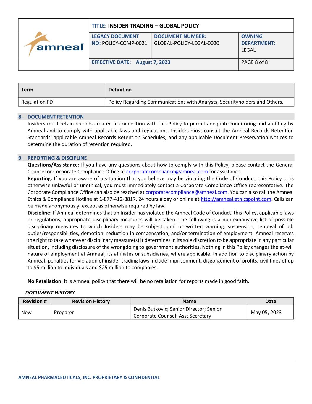 标题:内幕交易–全球政策遗产文件编号:POLICY-COMP-0021文件编号:GLOBAL-POLICY-LEGAL-0020所有权部门:法律生效日期:2023年8月7日第8页,共8页AMNEAL Pharmaceuticals,INC。关于与分析师、证券持有人和其他人沟通的专有和机密术语定义法规FD政策。8.文件保留内部人员必须保留与本政策相关的创建记录,以便允许Amneal进行充分的监测和审计,并遵守适用的法律法规。内部人士必须查阅Amneal记录保留标准、适用的Amneal记录保留时间表以及任何适用的文件保存通知,以确定所需的保留期限。9.报告&纪律问题/协助:如果您对如何遵守本政策有任何疑问,请通过corporatecompliance@amneal.com联系总法律顾问或企业合规办公室寻求协助。报告:如果您意识到您认为可能违反行为准则、本政策或其他非法或不道德的情况,您必须立即联系公司合规办公室代表。也可以通过corporatecompliance@amneal.com与企业合规办公室联系。您也可以24小时拨打Amneal伦理与合规热线1-877-412-8817或在线http://amneal.ethicspoint.com。除法律另有规定外,可匿名拨打电话。纪律:如果Amneal确定一名内部人员违反了Amneal行为准则、本政策、适用法律或法规,将采取适当的纪律措施。以下是内部人员可能受到的纪律处分措施的非详尽清单:口头或书面警告、停职、解除工作职责/责任、降职、减少补偿和/或终止雇用。Amneal保留在任何特定情况下采取其自行决定适当的任何纪律措施的权利,包括向政府当局披露不当行为。本政策中的任何内容均不会改变Amneal、其关联公司或子公司(如适用)的随意雇用性质。除了Amneal的纪律处分外,违反内幕交易法的处罚还包括监禁、上缴利润、对个人处以最高500万美元的民事罚款和对公司处以2500万美元的民事罚款。不报复:善意举报不报复是Amneal政策。Document History Revision # Revision History Name Date New Preparer Denis Butkovic;高级董事;高级公司法律顾问;助理秘书2023年5月5日