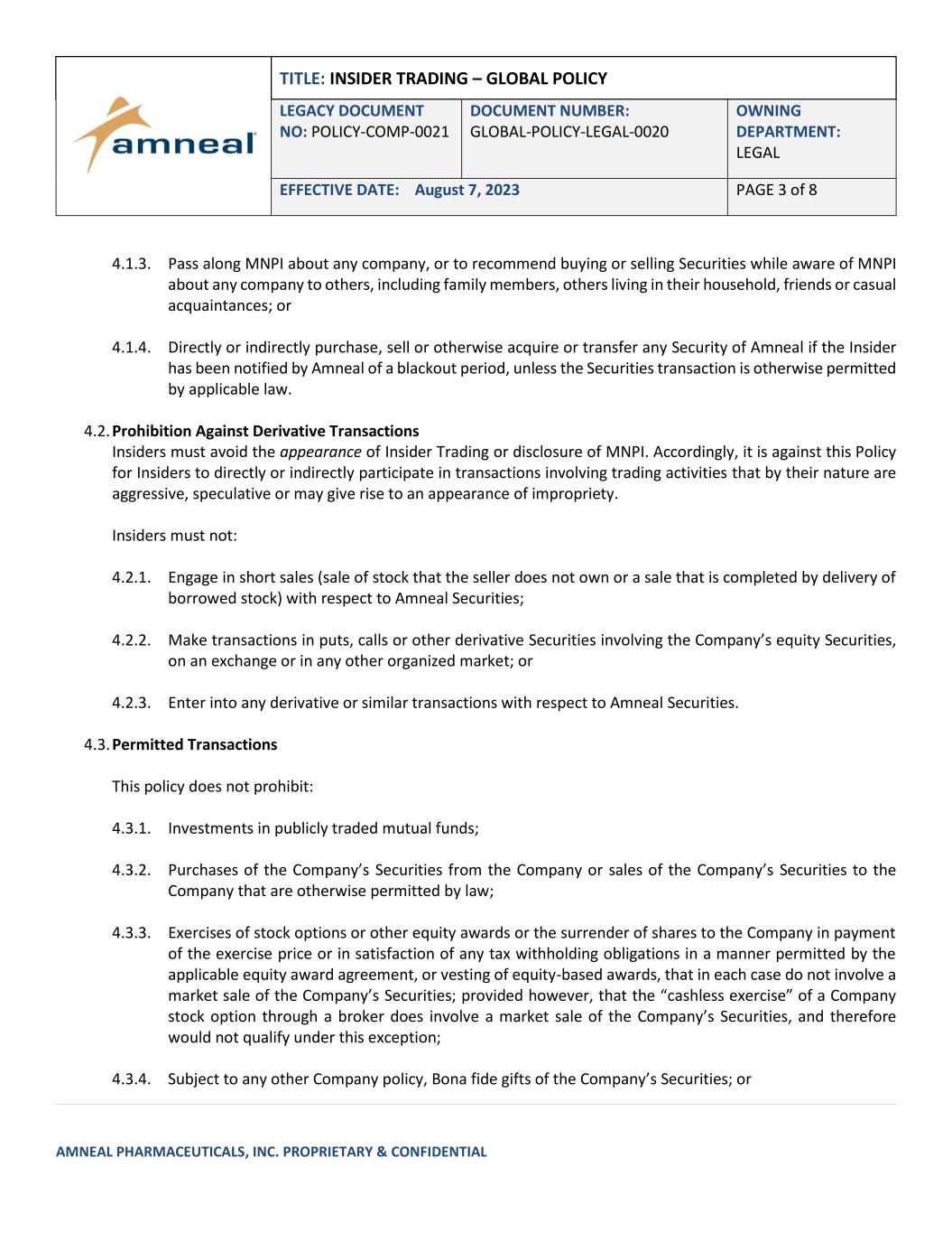 标题:内幕交易–全球政策遗产文件编号:POLICY-COMP-0021文件编号:GLOBAL-POLICY-LEGAL-0020所有权部门:法律生效日期:2023年8月7日第3页,共8页AMNEAL Pharmaceuticals,INC。专有&机密4.1.3。传递关于任何公司的MNPI,或在了解关于任何公司的MNPI时向他人推荐买卖证券,包括家庭成员、居住在其家中的其他人、朋友或偶然的熟人;或4.1.4。直接或间接购买、出售或以其他方式获得或转让Amneal的任何证券,如果内幕人士已获Amneal通知禁售期,除非适用法律另有许可进行证券交易。4.2.禁止衍生交易内幕信息知情人必须避免内幕交易的出现或MNPI的披露。据此,内幕信息知情人直接或间接参与交易涉及的交易活动,其性质具有侵略性、投机性或可能产生不正当行为的表象,是违反这一政策的。内部人士不得:4.2.1。就Amneal Securities从事卖空(出售卖方不拥有的股票或通过交付借入股票完成的出售);4.2.2。在交易所或任何其他有组织的市场上以涉及公司股本证券的看跌期权、看涨期权或其他衍生证券进行交易;或4.2.3。就Amneal Securities订立任何衍生工具或类似交易。4.3.允许的交易本政策不禁止:4.3.1。投资于公开交易的共同基金;4.3.2。向公司购买公司证券或向公司出售法律另有许可的公司证券;4.3.3。行使股票期权或其他股权奖励或以适用的股权奖励协议允许的方式向公司交出股份以支付行权价或履行任何预扣税款义务,或授予基于股权的奖励,在每种情况下均不涉及公司证券的市场出售;但前提是,通过经纪人“无现金行使”公司股票期权确实涉及公司证券的市场出售,因此在这一例外情况下不符合条件;4.3.4。在符合任何其他公司政策的情况下,公司证券的善意馈赠;或