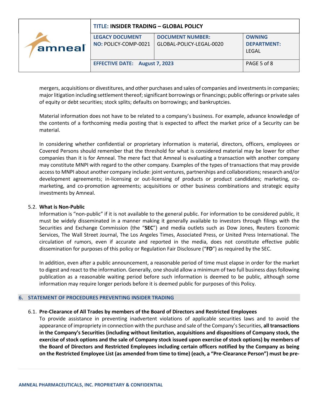 标题:内幕交易–全球政策遗产文件编号:POLICY-COMP-0021文件编号:GLOBAL-POLICY-LEGAL-0020所有权部门:法律生效日期:2023年8月7日第5页,共8页AMNEAL Pharmaceuticals,INC。专有和机密的合并、收购或剥离,以及公司的其他购买和出售以及对公司的投资;包括和解在内的重大诉讼;重大借款或融资;公开发行或私下出售股权或债务证券;股票分割;借款违约;以及破产。重大信息不一定要与公司业务相关。例如,预先了解预计会影响证券市场价格的即将发布的媒体帖子的内容可能是重要的。在考虑机密或专有信息是否重要时,董事、高级职员、雇员或相关人员应记住,其他公司被视为重要信息的门槛可能比Amneal更低。Amneal正在评估与另一家公司的交易这一事实可能构成对另一家公司的MNPI。可能提供有关另一家公司的MNPI准入的交易类型的例子包括:合资企业、伙伴关系和合作;研究和/或开发协议;产品或候选产品的内部许可或外部许可;营销、共同营销和共同推广协议;AmNeal的收购或其他业务合并以及战略股权投资。5.2.什么是非公开信息,不向公众公开就是“非公开”。信息要被视为公开,必须通过向美国证券交易委员会(“SEC”)和道琼斯、路透经济服务、华尔街日报、洛杉矶时报、美联社或联合国际等媒体提交的文件,以使投资者普遍可以获得的方式广泛传播。谣言的传播,即使准确并在媒体上报道,也不构成SEC要求的就本政策或法规公平披露(“FD”)而言的有效公开传播。此外,即使在公开宣布之后,也必须经过一段合理的时间,才能让市场对信息进行消化和反应。一般来说,在此类信息被视为公开之前,应允许在发布后至少两个完整的工作日作为合理的等待期,尽管出于本政策的目的,某些信息在被视为公开之前可能需要更长的时间。6.防止内幕交易的程序说明6.1。董事会成员和受限员工的所有交易的预先清仓,以提供协助,防止因疏忽违反适用的证券法,并避免出现与买卖公司证券、公司证券的所有交易(包括但不限于收购和处置公司股票、董事会成员和受限制雇员(包括经公司通知列入受限制雇员名单(经不时修订)的若干高级人员)行使股票期权及出售因行使股票期权而发行的公司股票(各自称为“预先清盘人”)必须预先─