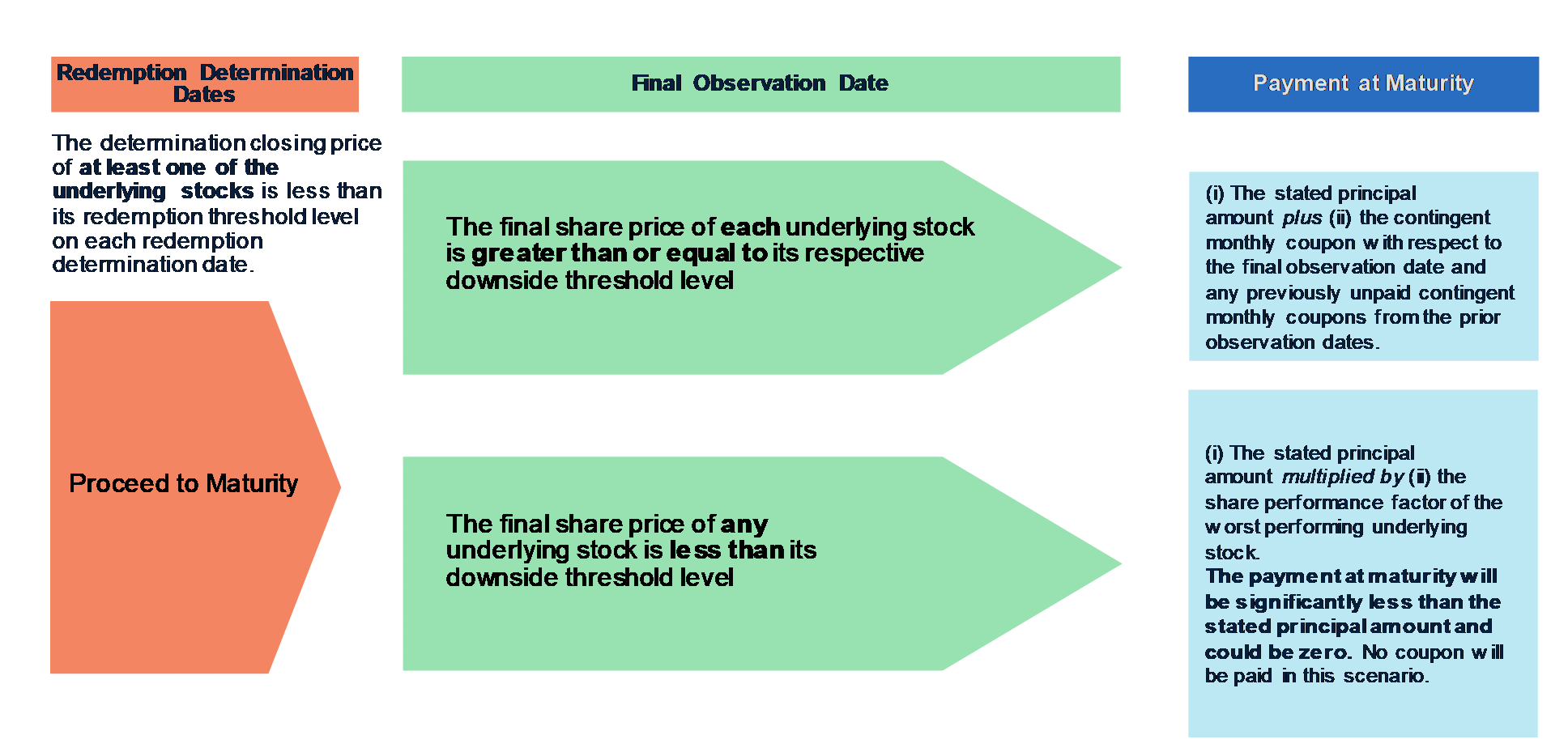 若证券未在到期前赎回,投资者将在到期时收到一笔款项,确定如下: ●如果每只标的股票的最终股价大于或等于其各自的下行阈值水平:(i)规定的本金金额加上(ii)与最终观察日相关的或有月息票以及与先前观察日相关的任何先前未支付的或有月息票 ●如果任何基础股票的最终股价低于其各自的下跌阈值水平:(i)规定的本金金额乘以(ii)表现最差的基础股票的股票表现因子 在这种情况下,到期付款将大大低于规定的本金金额1000美元,并将代表超过30%的损失,可能是全部损失。 |