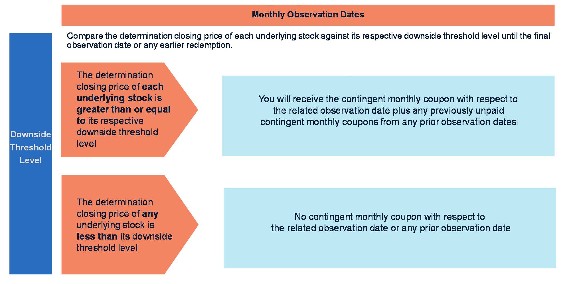 将在每个息票支付日就证券支付年利率为17.05%的或有月息票(相当于每份证券每月约14.208美元)加上任何先前观察日期的任何先前未支付的或有月息票,但前提是每只标的股票的确定收盘价在相关观察日期处于或高于其各自的下行阈值水平;但前提是,在任何此类支付先前未支付的或有月息票的情况下,自该等未付或有月息票的原始利息期结束之日起及之后,不得就该等未付或有月息票产生或须支付额外利息。如果任何标的股票在随后的每个观察日的确定收盘价低于其各自的下跌阈值水平,您将不会收到此类未支付的或有月息票。 如果在任何观察日,任何标的股票的确定收盘价低于其各自的下跌阈值水平,则不会就该观察日支付或有月息票。有可能一只或多只标的股票将在较长时间内甚至在证券的整个4年期限内保持低于其各自的下行阈值水平,这样您将获得很少或根本没有或有月息票。 |