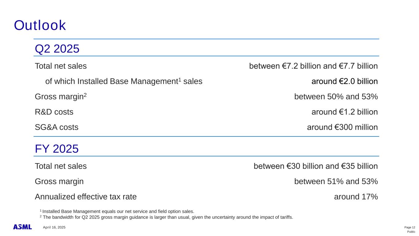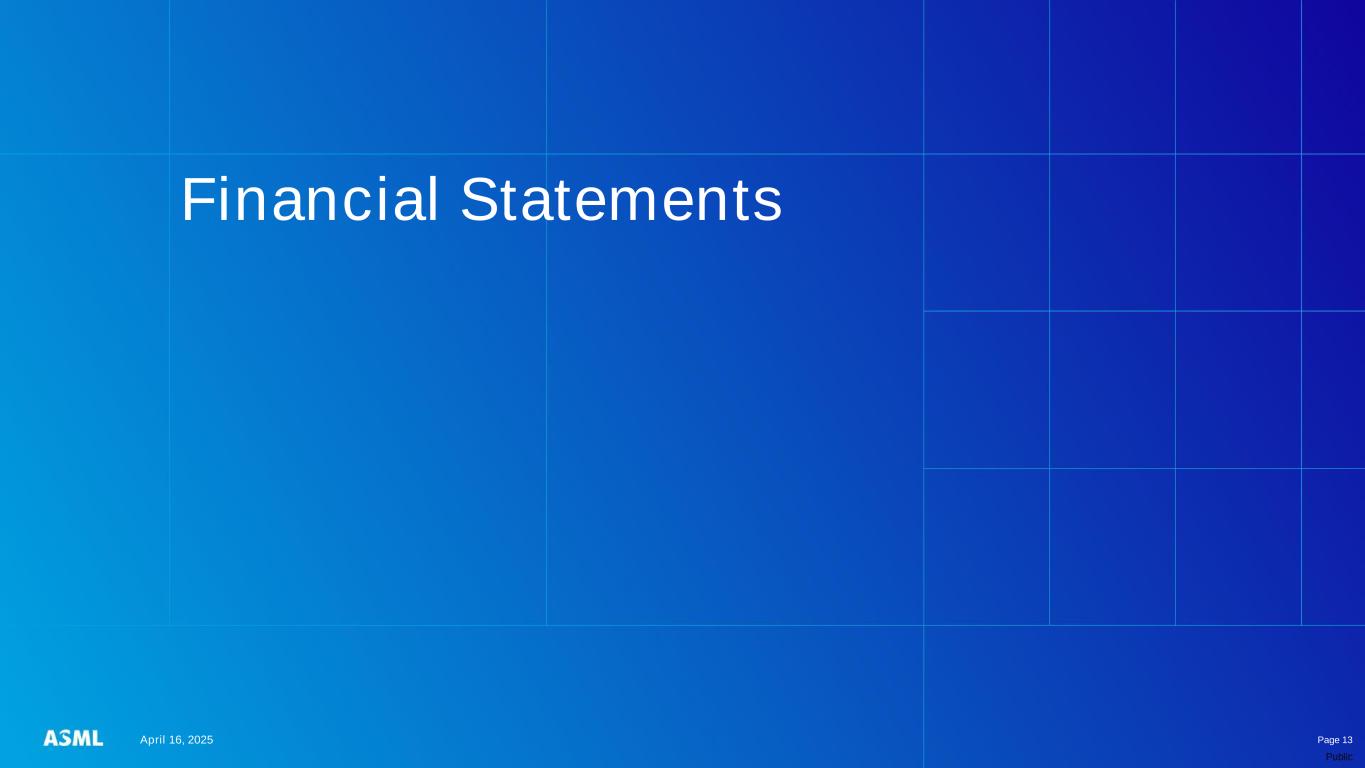 第12页2025年4月16日公共展望1已安装的基地管理等于我们的净服务和现场期权销售。2鉴于关税影响的不确定性,2025年第二季度毛利率指引的带宽比平时更大。2025年第二季度总净销售额在72亿欧元至77亿欧元之间,其中安装基础管理1销售额约为20亿欧元毛利率2在50%至53%之间研发成本约为12亿欧元SG & A成本约为3亿欧元2025财年总净销售额在300亿欧元至350亿欧元之间毛利率在51%至53%之间年化有效税率约为17%