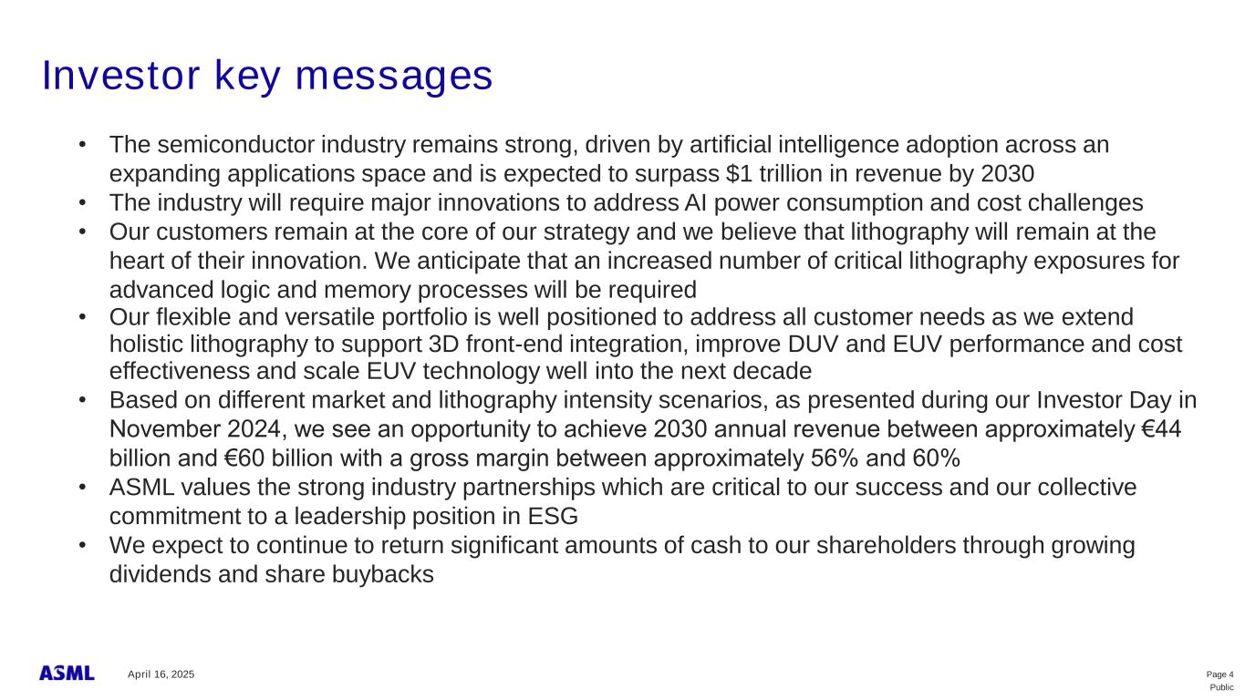 第4页2025年4月16日公众投资者关键信息•半导体行业在不断扩大的应用领域采用人工智能的推动下保持强劲,预计到2030年收入将超过1万亿美元•该行业将需要重大创新来应对AI功耗和成本挑战•我们的客户仍然是我们战略的核心,我们相信光刻技术仍将是他们创新的核心。我们预计,将需要更多用于先进逻辑和内存工艺的关键光刻曝光•我们灵活且多功能的产品组合能够很好地满足所有客户需求,因为我们将整体光刻技术扩展到支持3D前端集成,提高DUV和EUV性能和成本效益,并将EUV技术扩展到下一个十年•基于不同的市场和光刻强度场景,正如我们在2024年11月投资者日期间所介绍的那样,我们看到了实现2030年营收约为440亿欧元至600亿欧元、毛利率约为56%至60%之间的机会• ASML重视强大的行业合作伙伴关系,这对我们的成功至关重要,也是我们对ESG领导地位的集体承诺•我们预计将通过不断增加的股息和股票回购,继续向股东返还大量现金