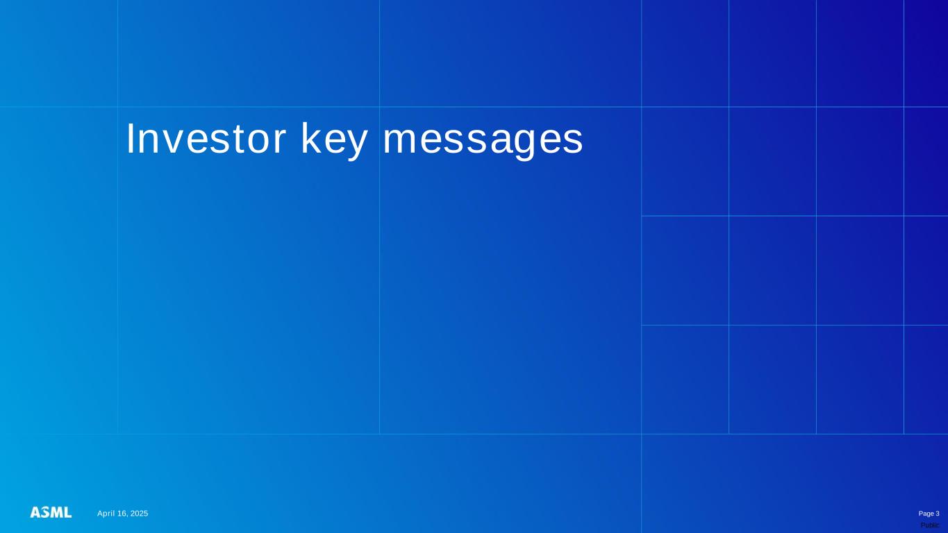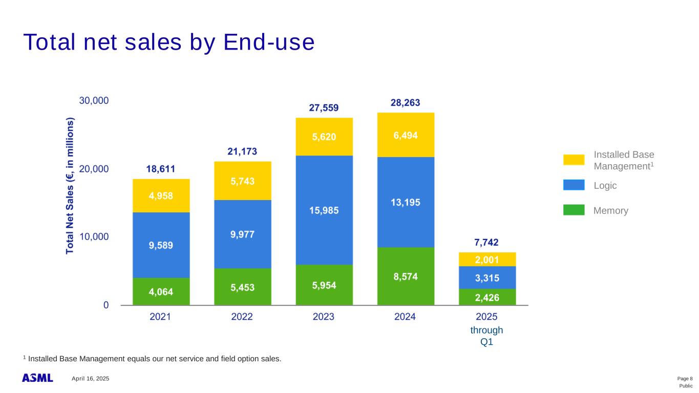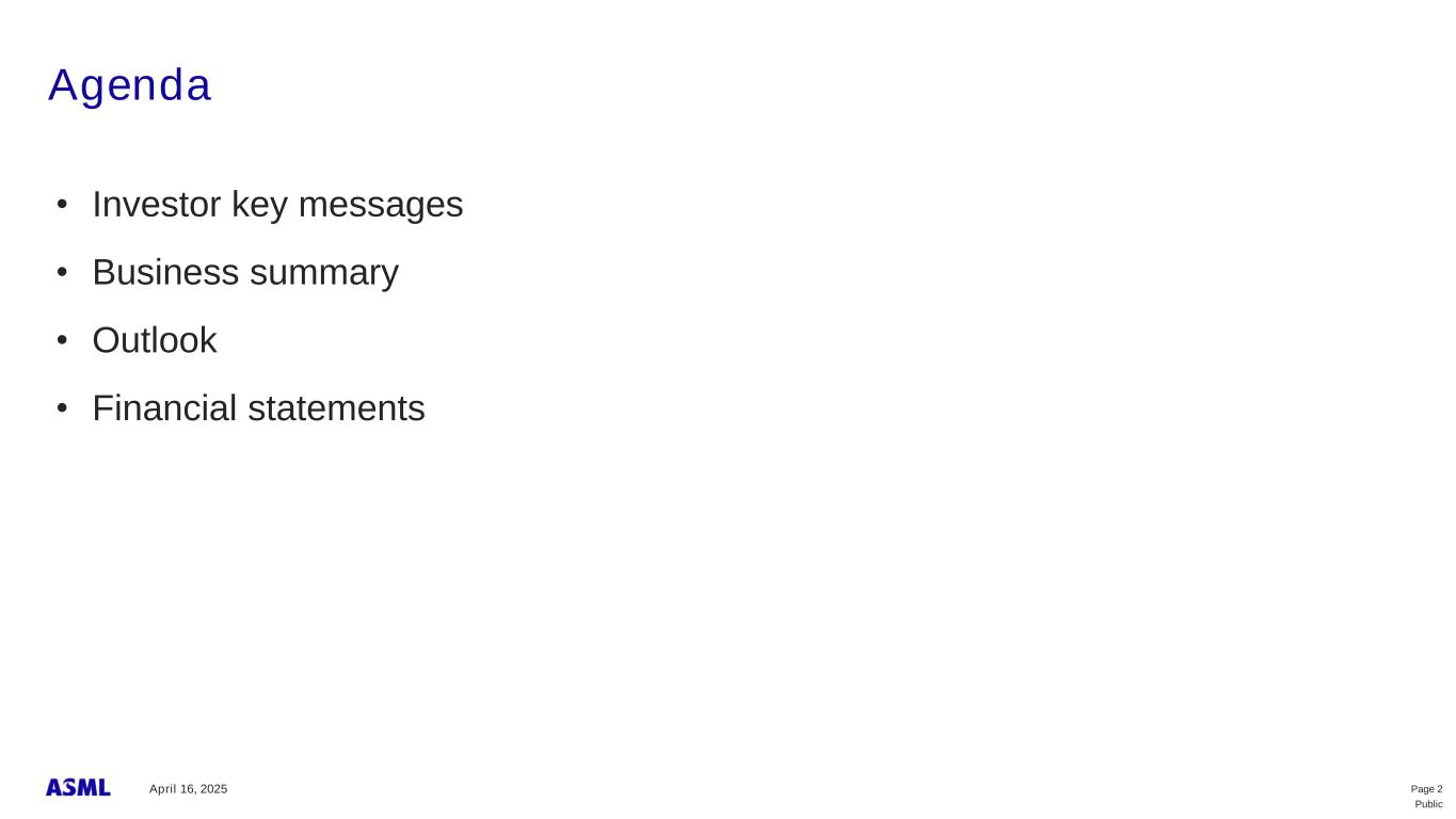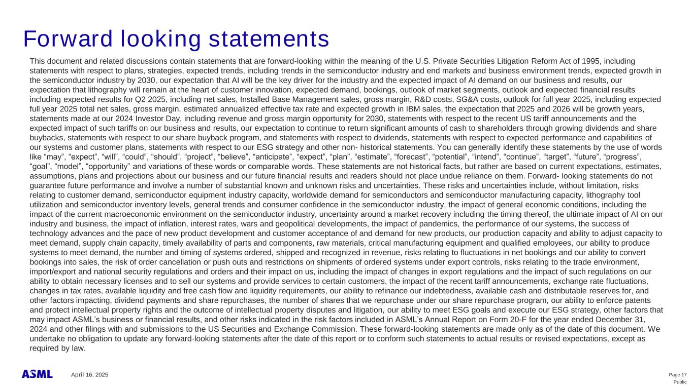 第17页2025年4月16日公开本文件和相关讨论包含1995年美国私人证券诉讼改革法案含义内的前瞻性陈述,包括有关计划、战略、预期趋势的陈述,包括半导体行业和终端市场的趋势和商业环境趋势、半导体行业到2030年的预期增长、我们对人工智能将成为行业关键驱动因素的预期以及人工智能需求对我们的业务和业绩的预期影响、我们对光刻技术仍将是客户创新、预期需求、预订的核心的预期,细分市场的前景、前景和预期财务业绩,包括2025年第二季度的预期业绩,包括净销售额、已安装基地管理销售额、毛利率、研发成本、SG & A成本、2025年全年的前景,包括预计2025年全年的总净销售额、毛利率、估计的年化有效税率和IBM销售额的预期增长,预计2025年和2026年将是增长年份,在2024年投资者日上所做的陈述,包括2030年的收入和毛利率机会,关于美国最近宣布的关税以及此类关税对我们的业务和业绩的预期影响的声明、我们通过不断增加的股息和股票回购继续向股东返还大量现金的预期、关于我们股票回购计划的声明、关于股息的声明、关于我们系统和客户计划的预期业绩和能力的声明、关于我们的ESG战略的声明和其他非历史性声明。你一般可以通过使用“可能”、“预期”、“将”、“可以”、“应该”、“项目”、“相信”、“预期”、“计划”、“估计”、“预测”、“潜力”、“打算”、“继续”、“目标”、“未来”、“进展”、“目标”、“模式”、“机会”等词语来识别这些陈述,以及这些词语或类似词语的变体。这些陈述不是历史事实,而是基于当前对我们业务和未来财务业绩的预期、估计、假设、计划和预测,读者不应过分依赖它们。前瞻性陈述并不能保证未来的业绩,并涉及大量已知和未知的重大风险和不确定性。这些风险和不确定因素包括但不限于与客户需求、半导体设备行业产能、全球对半导体和半导体制造产能的需求、光刻工具利用率和半导体库存水平、半导体行业的一般趋势和消费者信心、总体经济状况的影响,包括当前宏观经济环境对半导体行业的影响、围绕市场复苏的不确定性(包括其时间)、人工智能对我们的行业和业务的最终影响、通货膨胀、利率、战争和地缘政治发展的影响、流行病的影响、我们系统的性能,技术进步的成功和新产品开发的速度以及客户对新产品的接受和需求,我们的生产能力和调整能力以满足需求,供应链能力,零部件、原材料、关键制造设备和合格员工的及时可用性,我们生产系统以满足需求的能力,订购、发货和确认收入的系统的数量和时间,与净预订量波动相关的风险以及我们将预订量转化为销售额的能力,订单取消或推出的风险以及出口管制下已订购系统的发货限制,与贸易环境、进出口和国家安全法规和订单相关的风险及其对我们的影响,包括出口法规变化的影响以及此类法规对我们获得必要许可证以及向某些客户销售我们的系统和提供服务的能力的影响,近期关税公告的影响、汇率波动、税率变化、可用流动性和自由现金流以及流动性要求、我们为债务再融资的能力,用于股息支付和股份回购的可用现金和可分配储备,以及其他影响因素,我们根据股份回购计划回购的股份数量,我们执行专利和保护知识产权的能力以及知识产权纠纷和诉讼的结果,我们实现ESG目标和执行ESG战略的能力,可能影响ASML的业务或财务业绩的其他因素,以及丨阿斯麦截至12月31日止年度的20-F表格年度报告中所载风险因素中提示的其他风险因素, 2024和其他向美国证券交易委员会提交的文件和提交的文件。这些前瞻性陈述仅在本文件发布之日作出。除法律要求外,我们不承担在本报告日期之后更新任何前瞻性陈述或使此类陈述符合实际结果或修订后的预期的义务。前瞻性陈述