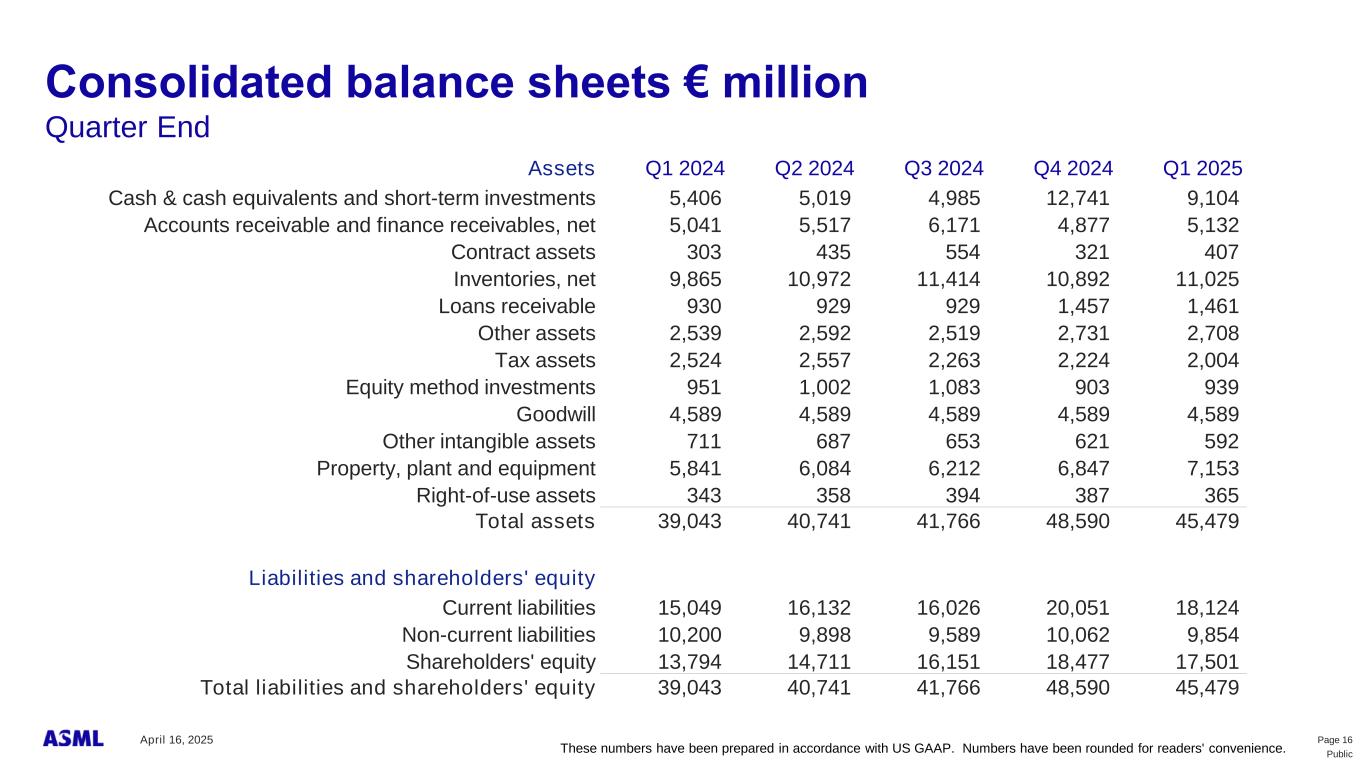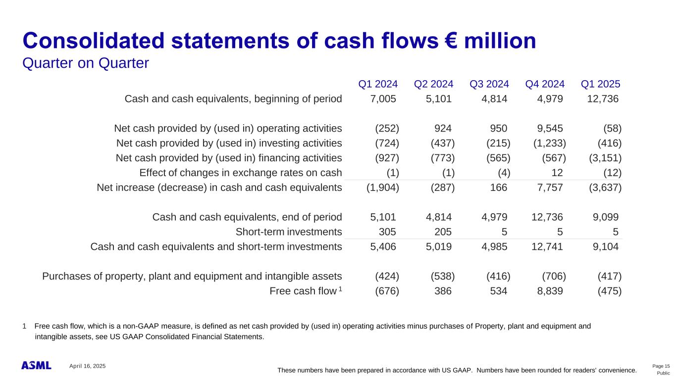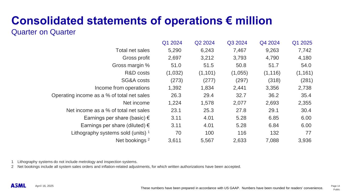 第14页4月16日,2025年公共合并经营报表百万欧元环比Q1 2024 Q2 2024 Q3 2024 Q4 2024 Q1 2025总净销售额5,2906,2437,4679,2637,742毛利润2,6973,2123,7934,7904,180毛利率% 51.05 1.55 0.85 1.75 4.0研发成本(1,032)(1,101)(1,055)(1,116)(1,161)SG & A成本(273)(277)(297)(318)(281)营业收入1,3921,8342,4413,3562,738营业收入占总净销售额的百分比26.32 9.43 2.7 36.235.4净收入1,2241,578 2,0772,6932,355净收入占总净销售额的百分比23.125.3 27.82 9.13 0.4每股收益(基本)欧元3.11 4.01 5.286.856.00每股收益(稀释后)欧元3.11 4.01 5.286.846.00已售光刻系统(台)17010011613277净预订量23,6115,5672,6337,0883,9361光刻系统不包括计量和检测系统。2净预订量包括所有系统销售订单和通胀相关调整,已接受书面授权。这些数字是根据美国通用会计准则编制的。为方便读者阅读,数字已四舍五入。