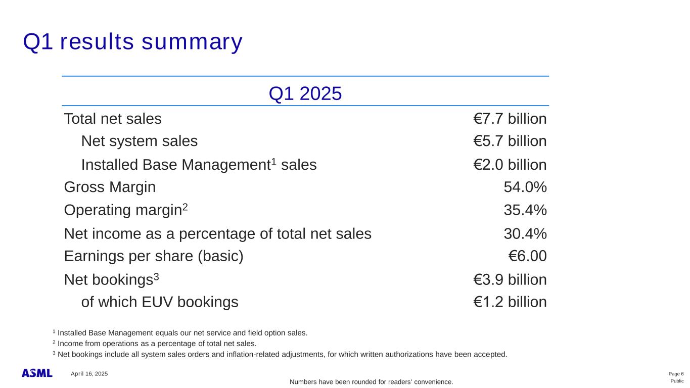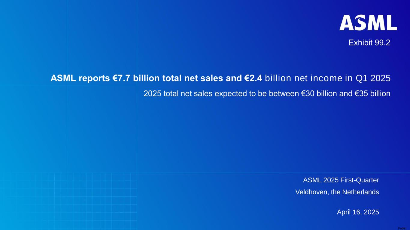 ASML 2025年第一季度荷兰维尔德霍芬2025年4月16日丨ASML报告2025年第一季度总净销售额为77亿欧元,净收入为24亿欧元2025年第一季度总净销售额预计在300亿欧元至350亿欧元之间附件 99.2
