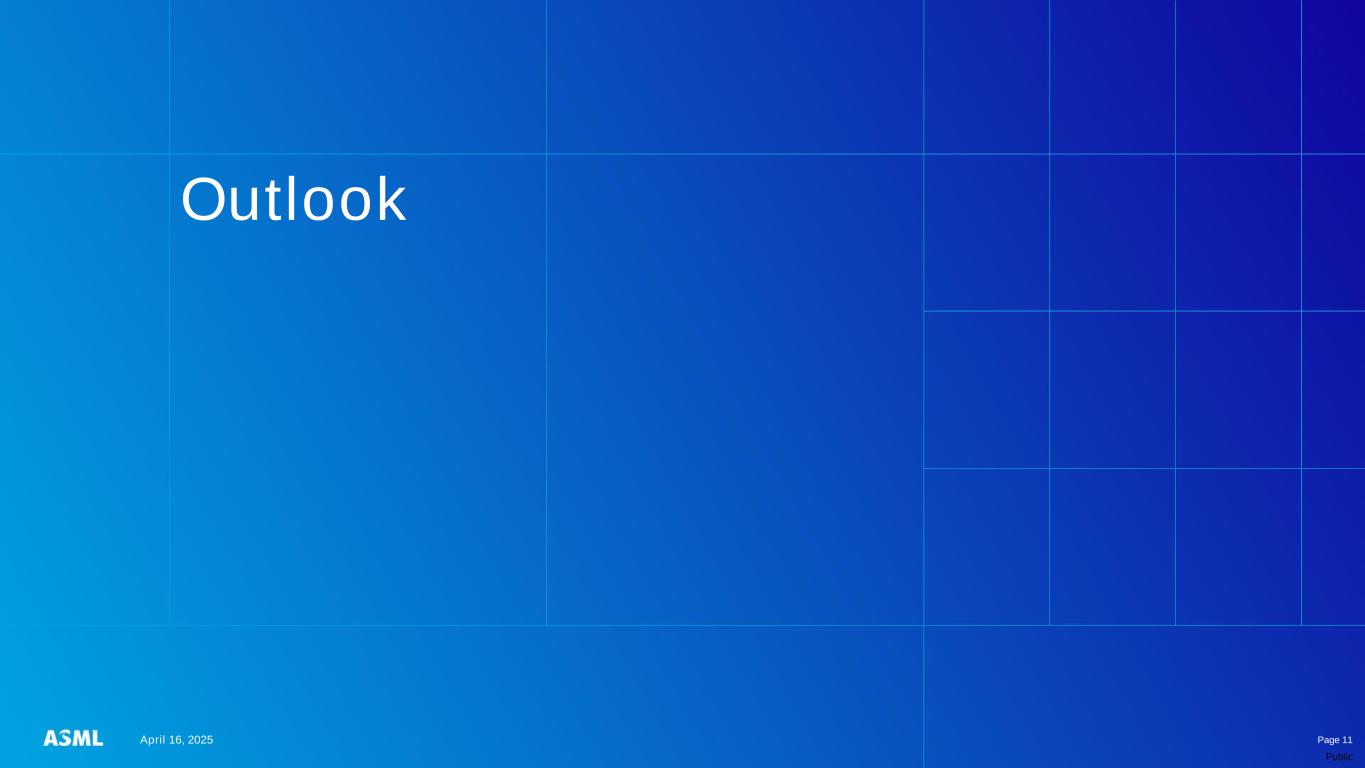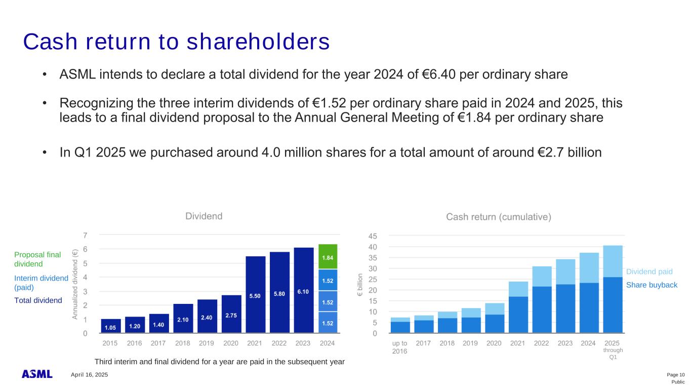 第10页2025年4月16日公用• ASML拟宣派2024年股息总额为每股普通股6.40欧元•确认2024年和2025年支付的三次中期股息为每股普通股1.52欧元,这导致向年度股东大会提出的末期股息提议为每股普通股1.84欧元•在2025年第一季度,我们购买了约400万股股票,总金额约为27亿欧元现金回报股东股票回购股息已支付一年的第三次中期和末期股息在随后一年支付股息总额中期股息(已支付)提议截至第一季度的末期股息