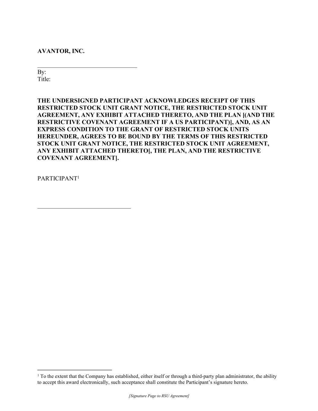 Avantor, Inc.由:标题:undersigned参与者确认收到本限制性股票单位授予通知、限制性股票单位协议、其随附的任何展览、计划[(如果是美国参与者,则为限制性公约协议)],并作为此处授予限制性股票单位的明示条件,同意受本限制性股票单位授予通知的条款约束,限制性股票单位协议参与者1 1只要公司本身或通过第三方计划管理人建立了以电子方式接受这项奖励的能力,这种接受应构成参与者在此签署。[ RSU协议签署页]