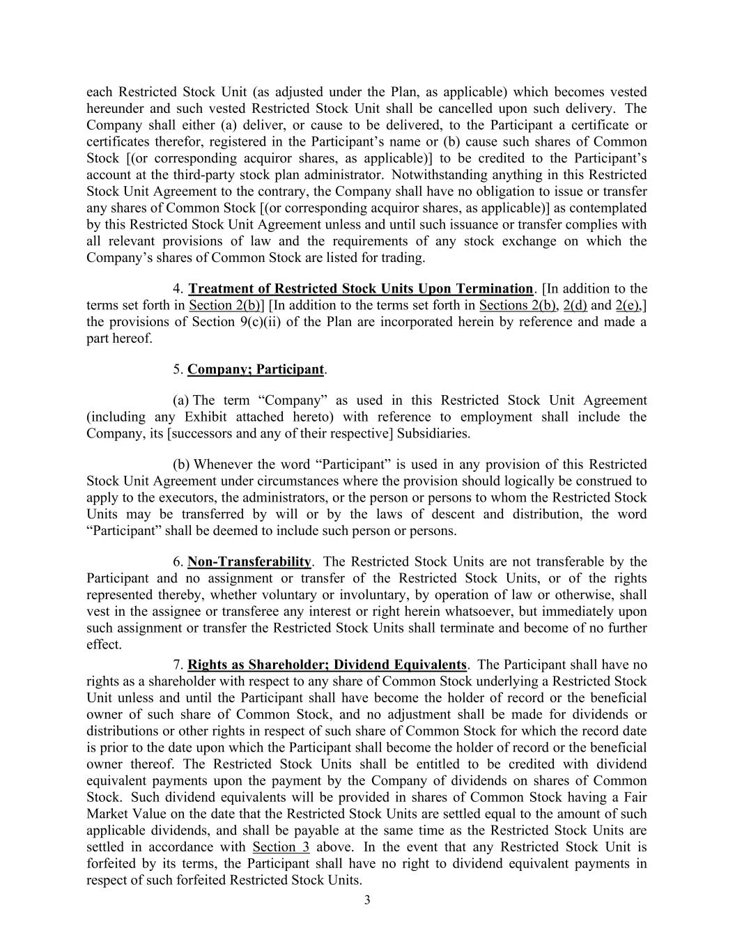 3根据本协议归属的每个限制性股票(根据本计划进行调整,视情况而定)且该归属的限制性股票应在该等交割时予以注销。公司应(a)向参与者交付或促使交付登记在参与者名下的一份或多份证书,或(b)促使将此类普通股股份[(或相应的收购人股份,如适用)]记入参与者在第三方股票计划管理人的账户。尽管本限制性股票协议中有任何相反的规定,公司没有义务按照本限制性股票协议的约定发行或转让任何普通股股份[(或相应的收购方股份,如适用)],除非且直至该发行或转让符合所有相关法律规定以及公司普通股股份上市交易的任何证券交易所的要求。4.限制性股票单位终止时的处理。[除了第2(b)节规定的条款] [除了第2(b)、2(d)和2(e)节规定的条款外,]计划第9(c)(ii)节的规定以引用方式并入本文,并成为本文的一部分。5.公司;参与者。(a)本限制性股票协议(包括随附的任何附件)中所使用的有关聘用的术语“公司”应包括公司、其[继任者及其各自的任何]子公司。(b)凡在本限制性股票协议的任何条款中使用“参与者”一词,且该条款在逻辑上应被解释为适用于遗嘱执行人、管理人或限制性股票单位可能通过遗嘱或根据出身和分配法律转让给的人或人,则“参与者”一词应被视为包括该人或人。6.不可转让性。限制性股票单位不可由参与者转让,且限制性股票单位或由此所代表的权利的任何转让或转让,无论是自愿或非自愿的,通过法律运作或其他方式,均不得赋予受让人或受让人任何在此的权益或权利,但限制性股票单位应在该等转让或转让后立即终止,并不再具有效力。7.作为股东的权利;股息等价物。除非且直至该参与者已成为该普通股股份的记录持有人或实益拥有人,否则该参与者对任何基于限制性股票的普通股股份不享有作为股东的权利,且不得就该记录日期在该参与者成为记录持有人或其实益拥有人日期之前的该普通股股份的股息或分配或其他权利进行调整。限制性股票单位有权在公司支付普通股股息时获得股息等值款项。此类股息等价物将以在限制性股票单位结算之日具有公平市场价值的普通股股份提供,金额等于此类适用股息的金额,并应在限制性股票单位根据上述第3节结算的同时支付。在任何限制性股票因其条款被没收的情况下,参与者无权就该等被没收的限制性股票单位获得等值股息支付。