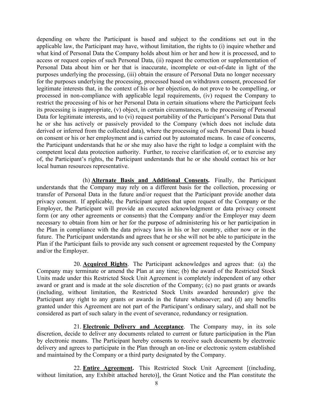 8根据参与者所基于的地点和在适用法律规定的条件的限制下,参与者可能有权(但不限于)(i)查询公司是否持有关于他或她的个人资料及其处理方式,以及访问或索取此类个人资料的副本,(ii)要求更正或补充关于他或她的个人资料,这些资料不准确、不完整或根据处理的基本目的已过时,(iii)获得对处理所依据的目的不再需要的、基于撤回同意而处理的、为合法利益而处理的个人数据的删除,但在其反对的背景下,这些处理并不证明是强制的,或在不符合适用法律要求的情况下进行处理,(iv)要求公司在参与者认为其处理不适当的某些情况下限制对其个人数据的处理,(v)在某些情况下反对为合法利益而处理个人数据,及(vi)要求参与者主动或被动向公司提供的个人数据(不包括从收集的数据中得出或推断的数据)的可移植性,在此情况下,此类个人数据的处理是基于同意或其受雇并通过自动化方式进行的。如有顾虑,参与者理解,他或她也可能有权向当地数据保护主管部门提出投诉。此外,要获得对参与者权利的澄清或行使其中任何一项权利,参与者理解应联系其当地人力资源代表。(h)备用基础和额外同意。最后,参与者理解,公司未来可能会依赖不同的基础来收集、处理或转移个人数据和/或要求参与者提供另一份数据隐私同意书。如适用,参与者同意,应公司或雇主的请求,参与者将提供公司和/或雇主可能认为必要的已签署的确认或数据隐私同意书(或任何其他协议或同意书),以便在现在或将来根据其所在国家的数据隐私法管理其参与计划。参与者理解并同意,如果参与者未能提供公司和/或雇主要求的任何此类同意或协议,他或她将无法参与该计划。20.获得的权利。参与者承认并同意:(a)公司可随时终止或修订该计划;(b)根据本限制性股票协议作出的受限制股份单位的授予完全独立于任何其他授予或授予,并由公司全权酌情作出;(c)过去的任何授予或奖励(包括但不限于根据本协议授予的受限制股份单位)均不赋予参与者在未来获得任何授予或奖励的任何权利;及(d)根据本协议授予的任何福利不属于参与者的普通薪酬,在发生遣散、裁员或辞职时,不得视为该等薪酬的一部分。21.电子交付和验收。公司可全权酌情决定以电子方式交付与当前或未来参与该计划有关的任何文件。参与者特此同意以电子交付方式接收此类文件,并同意通过公司或公司指定的第三方建立和维护的在线或电子系统参与该计划。22.全部协议。本限制性股票协议[(包括但不限于随附的任何附件)]、授予通知和计划构成对