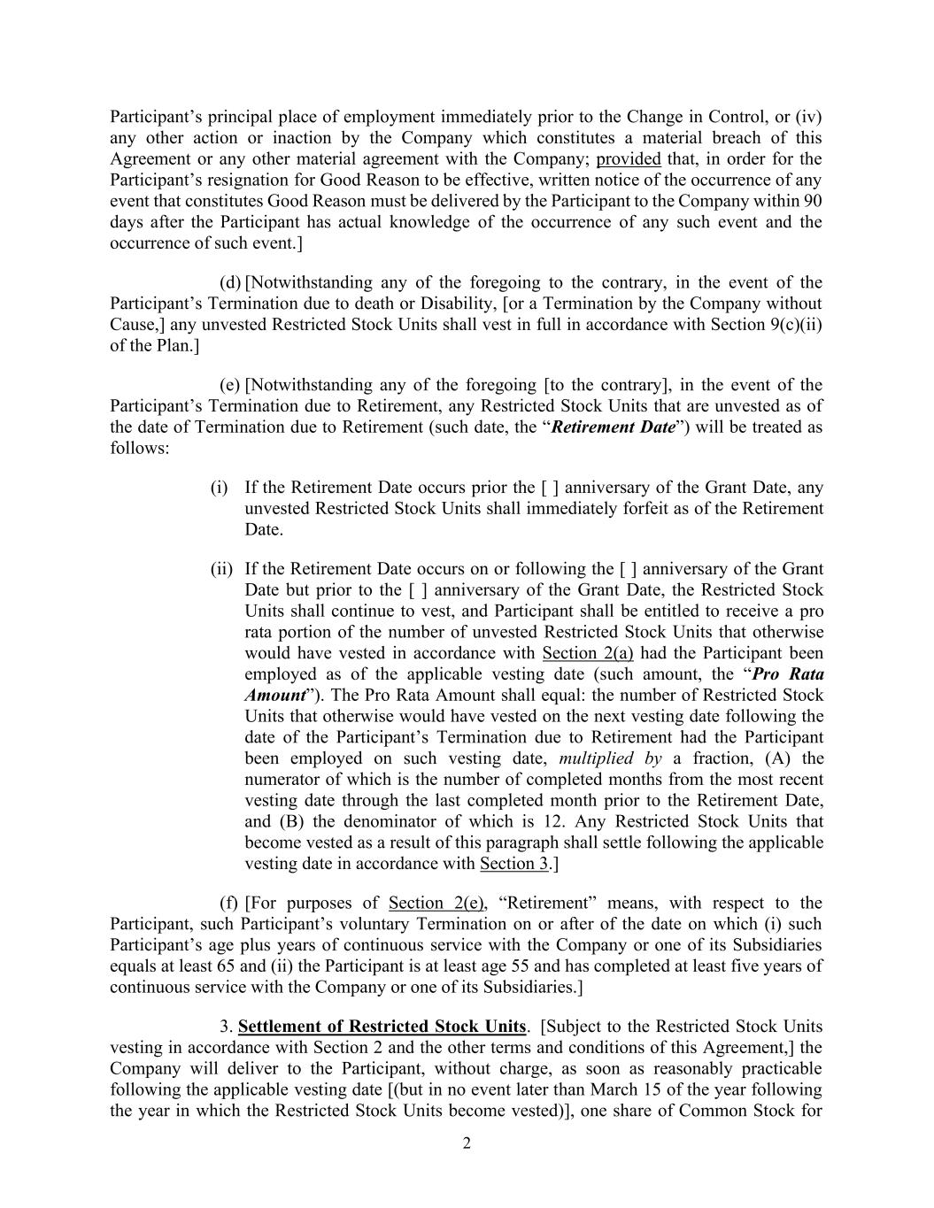 2紧接控制权变更前参与者的主要工作地点,或(iv)公司的任何其他作为或不作为构成对本协议或与公司的任何其他重大协议的重大违反;但为使参与者的正当理由辞职生效,构成正当理由的任何事件的发生的书面通知,必须由参与者在参与者实际知悉任何该等事件的发生和该等事件的发生后90天内送达公司。](d)[尽管有上述任何相反的规定,但如果参与者因死亡或残疾而终止,[或公司无故终止,]任何未归属的限制性股票单位应根据计划第9(c)(ii)节全额归属。](e)[尽管有上述任何[相反],在参与者因退休而终止的情况下,截至因退休而终止之日(该日期,“退休日期”)未归属的任何限制性股票单位将按以下方式处理:(i)如果退休日期发生在授予日的[ ]周年之前,则任何未归属的限制性股票单位将在退休日期立即被没收。(ii)如果退休日期发生在授予日的[ ]周年日或之后,但在授予日的[ ]周年日之前,则限制性股票单位应继续归属,而参与者应有权获得未归属的限制性股票单位数量的按比例部分,如果该参与者在适用的归属日期被雇用,则该数量本应根据第2(a)条归属(该金额,“按比例金额”)。按比例计算的金额应等于:如果参与者在该归属日受雇,否则本应在参与者因退休而终止日期后的下一个归属日归属的限制性股票单位的数量乘以分数,(a)其分子为从最近归属日到退休日期前最后一个完成月份的已完成月数,以及(b)其分母为12。因本款而归属的任何限制性股票单位,应在根据第3条适用的归属日期之后结算。](f)[就第2(e)条而言,“退休”是指,就参与者而言,该参与者在(i)该参与者的年龄加上在公司或其一家子公司的连续服务年限至少等于65岁和(ii)该参与者至少55岁并已在公司或其一家子公司完成至少五年的连续服务之日或之后自愿终止。] 3。限制性股票单位的结算。【受限于根据第2节和本协议的其他条款和条件归属的限制性股票单位,】公司将在适用的归属日期后在合理可行的范围内尽快向参与者免费交付[(但在任何情况下不得迟于限制性股票单位归属当年的次年3月15日)],一股普通股为