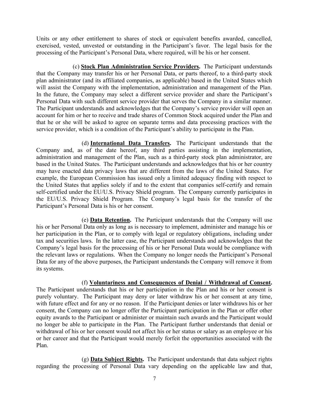 7个单位或任何其他权利的股票或同等利益的股份授予、注销、行使、归属、未归属或未归属于参与者。如有需要,处理参与者个人资料的法律依据将是他或她的同意。(c)股票计划管理服务提供商。参与者了解,公司可将其个人资料或其部分资料转让给设在美国的第三方股票计划管理人(及其关联公司,如适用),后者将协助公司实施、管理和管理该计划。未来,公司可能会选择不同的服务提供商,并与以类似方式为公司服务的此类不同服务提供商共享参与者的个人数据。参与者理解并承认,公司的服务提供商将为他或她开立一个账户,以接收和交易根据该计划获得的普通股股份,并将要求他或她与服务提供商就单独的条款和数据处理做法达成一致,这是参与者参与该计划的能力的一个条件。(d)国际数据转让。参与者了解到,公司以及截至本协议日期,协助实施、行政和管理该计划的任何第三方,例如第三方股票计划管理人,均位于美国。参与者了解并承认,其所在国家可能已制定了与美国法律不同的数据隐私法。例如,欧盟委员会仅针对美国发布了一项有限的充分性调查结果,该调查结果仅适用于公司根据欧盟/美国隐私盾计划进行自我认证并保持自我认证的情况和范围。该公司目前参与了欧盟/美国隐私盾计划。公司转让参与者个人资料的法律依据为本人同意。(e)数据保留。参与者了解,公司将仅在实施、管理和管理其参与计划或遵守法律或监管义务(包括根据税法和证券法)所需时使用其个人数据。在后一种情况下,参与者理解并承认公司处理其个人数据的法律依据将是遵守相关法律或法规。当公司不再需要参与者的个人数据用于上述任何目的时,参与者理解公司将从其系统中删除这些数据。(f)拒绝/撤回同意的自愿性和后果。参与者理解,他或她参与该计划和他或她的同意纯属自愿。参与者可随时拒绝或稍后撤回其同意,具有日后效力,并以任何理由或无理由。如果参与者拒绝或随后撤回其同意,公司不能再向参与者提供参与计划或向参与者提供其他股权奖励或管理或维持此类奖励,参与者将不再能够参与计划。参与者进一步理解,拒绝或撤回其同意不会影响其作为雇员的身份或工资或其职业生涯,参与者只会丧失与该计划相关的机会。(g)数据主体权利。参与者了解,有关处理个人数据的数据主体权利因适用法律而异,并且,