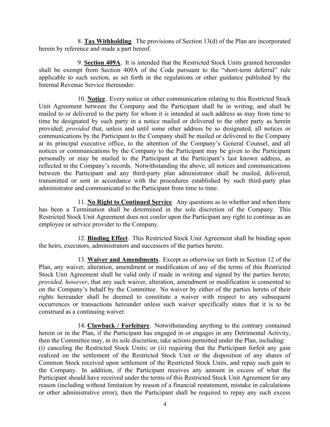 4 8.扣税。该计划第13(d)节的规定以引用方式并入本文,并成为本文的一部分。9.第409a节。本意是,根据美国国税局根据其发布的法规或其他指南中规定的适用于该部分的“短期延期”规则,根据本协议授予的限制性股票单位应免受《守则》第409A条的约束。10.注意。公司与参与者之间有关本限制性股票协议的每份通知或其他通讯均应采用书面形式,并应按该方在此处规定的邮寄或交付给另一方的通知中不时指定的地址邮寄给或交付给意向对象;但除非并直至如此指定的其他地址,否则参与者向公司发出的所有通知或通讯均应在其主要执行办公室邮寄或交付给公司,提请公司总法律顾问注意,公司向参与者发出的所有通知或通信可亲自发给参与者,也可邮寄至参与者最后为人所知的地址,这反映在公司的记录中。尽管有上述规定,参与者与任何第三方计划管理人之间的所有通知和通信均应按照该第三方计划管理人制定的程序邮寄、交付、传送或发送,并不时传达给参与者。11.没有继续服务的权利。有关是否及何时终止的任何问题,均由公司全权酌情决定。本限制性股票协议并不授予参与者任何继续作为公司雇员或服务提供者的权利。12.绑定效果。本限制性股票协议对协议各方的继承人、被执行人、管理人和继承人具有约束力。13.豁免及修订。除计划第12节另有规定外,对本限制性股票协议任何条款的任何放弃、变更、修订或修改,仅在以书面作出并由协议各方签署的情况下方为有效;但前提是任何此类放弃、变更、修订或修改由委员会代表公司同意。本协议任何一方放弃其在本协议项下的权利均不应被视为构成对本协议项下任何后续事件或交易的放弃,除非该放弃特别说明将被解释为持续放弃。14.追回/没收。尽管本计划或本计划中有任何相反的规定,如果参与者从事或从事了任何有害活动,则委员会可全权酌情采取计划允许的行动,包括:(i)注销限制性股票单位;或(ii)要求参与者没收因以限制性股票单位结算而实现的任何收益,或因在限制性股票单位结算时收到的任何普通股股份的处置而实现的任何收益,并将该收益偿还给公司。此外,如果参与者因任何原因(包括但不限于由于财务重述、计算错误或其他行政错误)而收到的金额超过该参与者根据本限制性股票协议条款应收到的金额,则该参与者应被要求偿还任何该等超出
