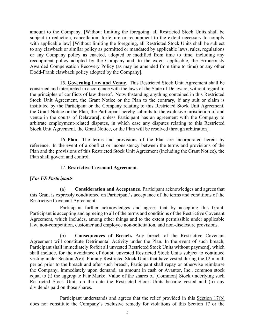 5金额为公司。【在不限制前述规定的情况下,所有限制性股票单位均应在符合适用法律所需的范围内进行减持、注销、没收或补偿】【在不限制前述规定的情况下,所有限制性股票单位均应遵守适用法律、规则、法规或不时颁布、采纳或修改的任何公司政策所允许或规定的任何回拨或类似政策,包括公司采取的任何补偿政策,并在适用的范围内,错误授予的赔偿追回政策(可能会不时修订)或公司采用的任何其他多德-弗兰克追回政策]。15.管辖法律和地点。本限制性股票协议应按照美国特拉华州法律进行解释和解释,不考虑其法律冲突的原则。尽管本限制性股票协议、授予通知或计划中有任何与之相反的规定,如参与者或公司就本限制性股票协议、授予通知或计划提起任何诉讼或索赔,参与者特此提交特拉华州法院的专属管辖权并在其开庭[,除非参与者与公司有就与雇佣相关的争议进行仲裁的协议,在这种情况下,与本限制性股票协议、授予通知或计划有关的任何争议将通过仲裁解决]。16.计划。该计划的条款和规定通过引用并入本文。计划的条款规定与本限制性股票协议(含授予通知书)的约定发生冲突或不一致的,由计划进行管辖和控制。17.限制性盟约协定。[对于美国参与者(a)考虑和接受。参与者承认并同意,此项授予明确以参与者接受限制性契约协议的条款和条件为条件。参与者进一步承认并同意,通过接受这项授予,参与者即接受并同意限制性契约协议的所有条款和条件,其中包括(其中包括)在适用法律允许的范围内,不竞争、客户和员工不招揽以及不披露条款。(b)违约后果。任何违反限制性契约协议的行为将构成该计划下的有害活动。如发生此类违约,参与者应立即没收所有未归属的限制性股票单位,而无需支付[,为免生疑问,其中应包括根据第2(e)条继续归属的未归属限制性股票单位]。对于在违约发生前和违约发生后的12个月期间内已归属的任何限制性股票单位,参与者应在提出要求后立即以现金或Avantor, Inc.、普通股的形式向公司偿还或以其他方式偿还相当于(i)在限制性股票单位归属之日该等限制性股票单位所涉[普通股]股票的股份的总公平市值以及(ii)就该等股份支付的任何股息。参与者理解并同意,本第17(b)条所提供的救济并不构成公司对违反本第17条或