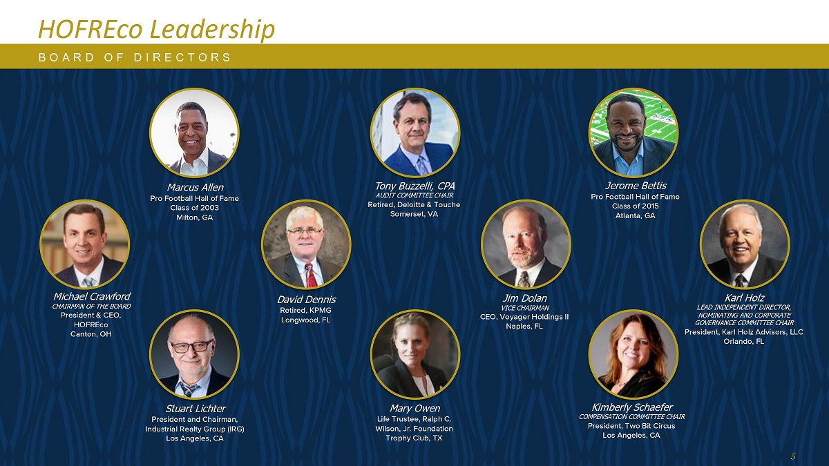 HOFREco Leadership B O A R D O F D I R E C T O R S Kimberly Schaefer COMP ENSAT ION COMMITTEE CHAIR Pre s i de n t,Tw o B i t C i rcus Los Angeles,加利福尼亚州David Dennis Re t i re d,KPMG Lon g w oo d,FL Jim Dolan VICE CHAIRMAN CEO,Voyager Holdings II Naples,FL Karl Holz Lead Independent Director,NANC E COMMITTEE CHAIR President,Karl Holz Advisors,LLC O r l a n d o,圣利希特主席兼主席,加利福尼亚州洛杉矶Mary Owen L i fe T r u ste e,Ral p h C. W i l so n,Jr. Fou n dat i o n Tro ph y C l u b,T X Marcus Allen Pro Fo o o t b a l Ha l l o f Fa m e C l ass o f 2003 M i l ton,G A T o n y B uz z elli,C P A AudIT COMMITTEE CHAIR Re t i re d,De l o i t e & T o u c h e S o m e rse t,VA Mich a el C r a w f o r d CHAIRMAN O F THE BO ARD Pre s i de n t & CEO,HOFREco C a n ton,OH Jerome Bettis Pro Fo o t b a l l Ha l l o f Fa m e C l ass o f 2015 Atlanta,GA 5