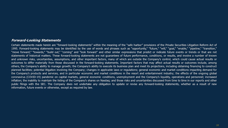 前瞻性陈述本文中的某些陈述属于1995年《私人证券诉讼改革法案》“安全港”条款所指的“前瞻性陈述”。前瞻性陈述可以通过使用诸如“机会”、“未来”、“将”、“目标”、“使能”、“管道”、“过渡”、“前进”、“迈向”、“建设”、“即将”和“展望”等词语和短语来识别,这些词语和短语可以预测或指示未来的事件或趋势,或者不是对历史事件的陈述。这些前瞻性陈述不是对未来业绩、条件或结果的保证,涉及许多已知和未知的风险、不确定性、假设和其他重要因素,其中许多因素不在公司的控制范围内,可能导致实际结果或结果与前瞻性陈述中讨论的结果或结果存在重大差异。可能影响实际结果或结果的重要因素包括:公司管理增长的能力;公司执行其业务计划和实现其预测的能力,包括获得建设计划设施的资金;涉及公司的潜在诉讼;适用法律或法规的变化;影响对公司产品和服务的需求的一般经济和市场状况,特别是度假村和娱乐业的经济和市场状况;持续的全球冠状病毒(COVID-19)大流行对资本市场的影响,一般经济状况,失业和公司的流动性、运营和人员;通货膨胀加剧;无法维持公司股票在纳斯达克的上市;以及我们的报告和提交给美国证券交易委员会的其他公开文件中不时讨论的风险和不确定性。公司不承担任何义务更新或修改任何前瞻性陈述,无论是由于新信息、未来事件或其他原因,除非法律要求。33