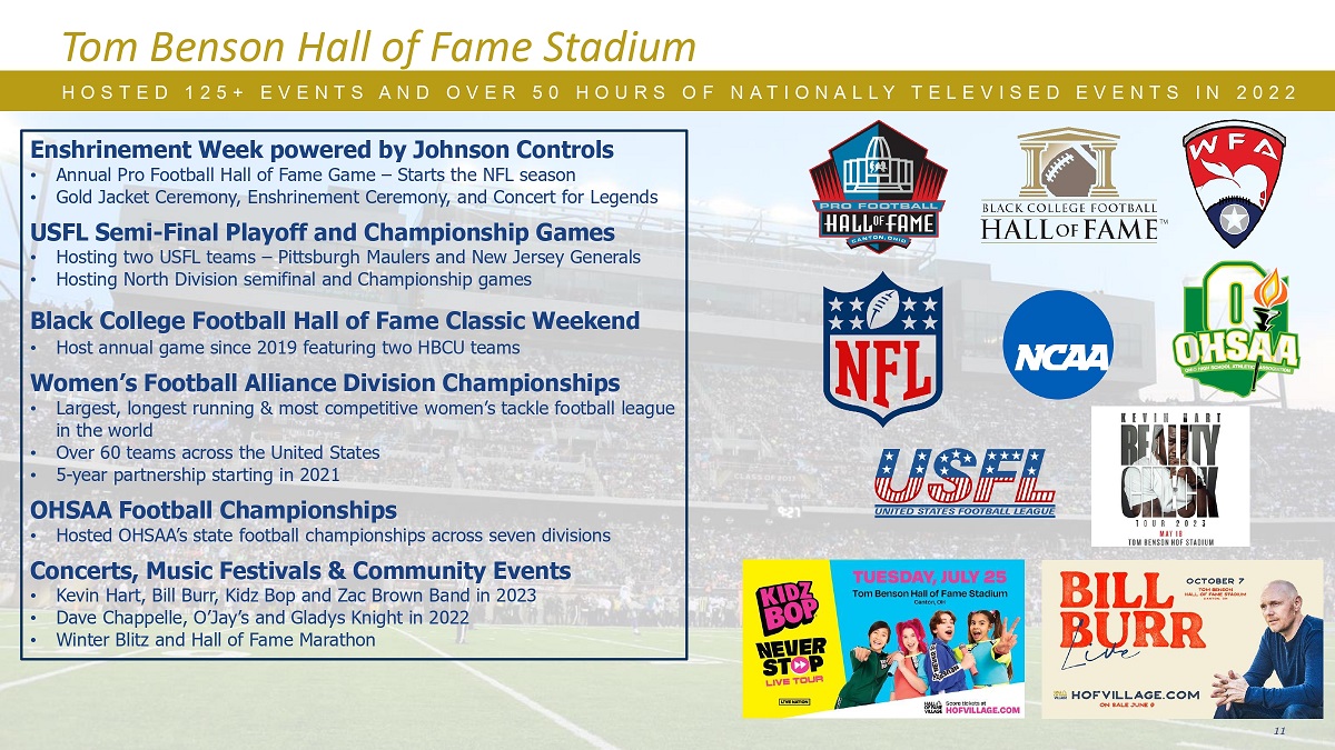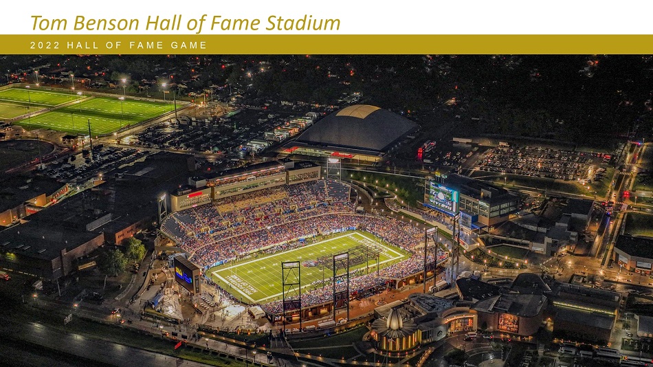 O F N A T I O N A L L Y T E L E V I S E D E V E N T S I N 2022 Tom Benson Hall of Fame体育场H O S T E D 125 + E V E N T S A N D O V E R 50 H O U R S供奉周由江森自控提供支持•年度职业橄榄球Hall of Fame比赛– NFL赛季开始•金夹克仪式,供奉仪式,和传奇音乐会USFL半决赛-季后赛和冠军赛•主办两支USFL球队-匹兹堡毛勒队和新泽西将军•主办北区半决赛和冠军赛黑人大学橄榄球Hall of Fame经典周末•自2019年起主办年度比赛,由两支HBCU球队组成的女子足球联盟分区锦标赛•世界上规模最大、运行时间最长、竞争最激烈的女子铲球足球联赛•美国各地60多支球队•从2021年开始为期5年的合作伙伴关系OHSAA足球锦标赛•主办OHSAA州橄榄球锦标赛,横跨七个分区,音乐节和社区活动• 2023年凯文·哈特、比尔·伯尔、Kidz Bop和Zac Brown乐队• 2022年Dave Chappelle、O’Jay’s和Gladys Knight • 2022年冬季闪电战和Hall of Fame马拉松11