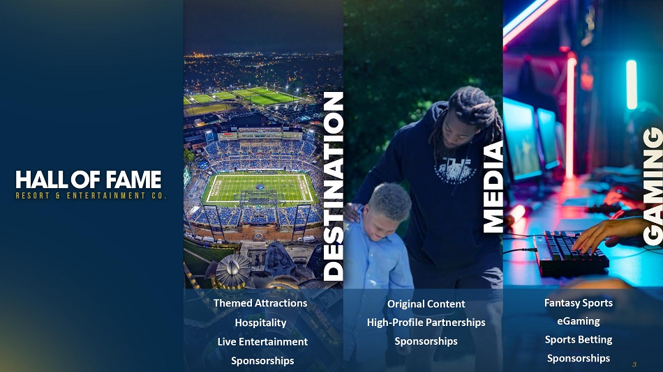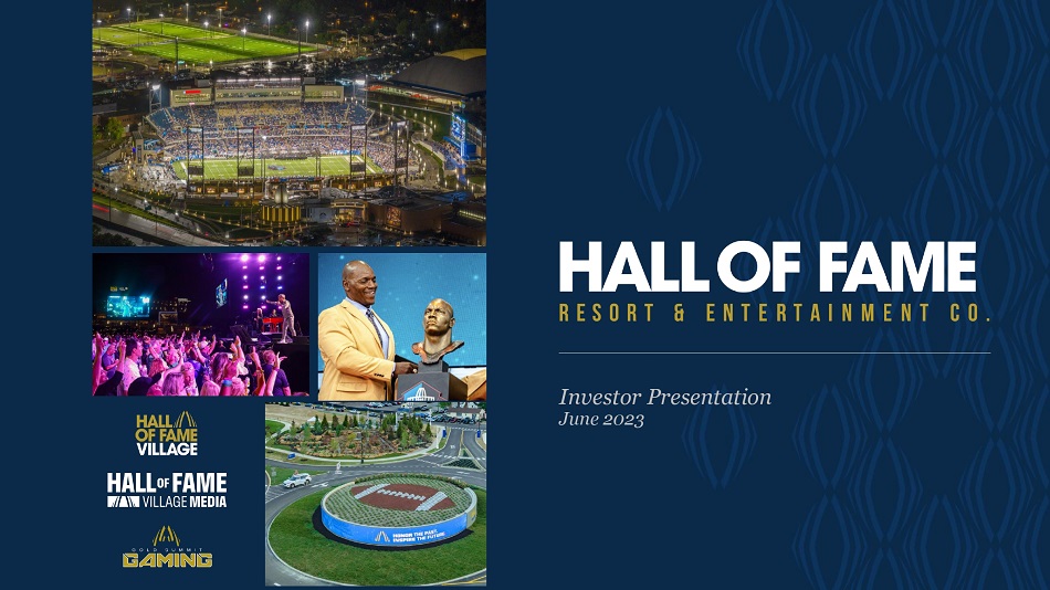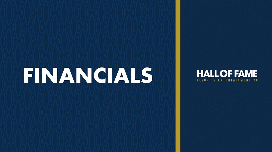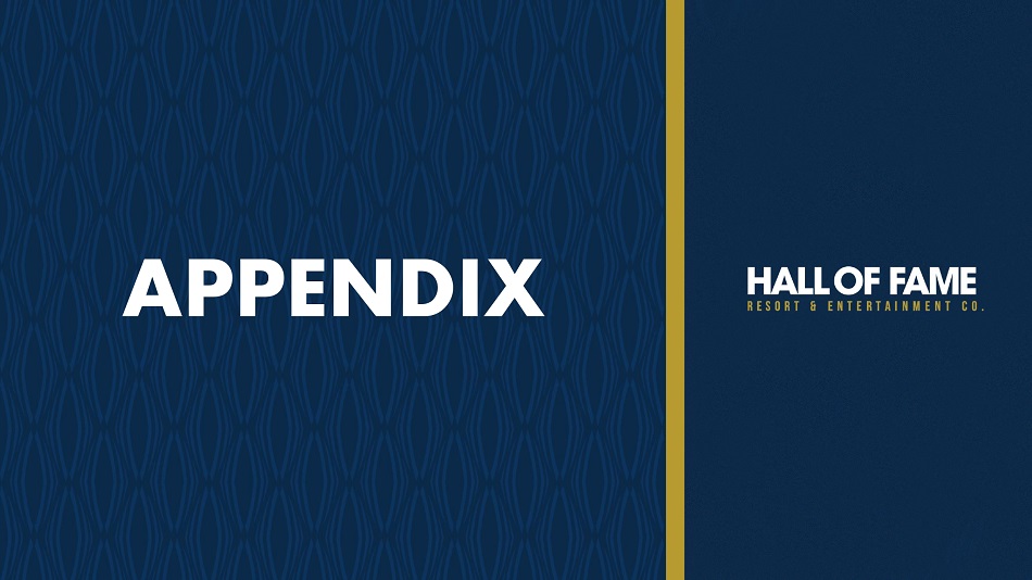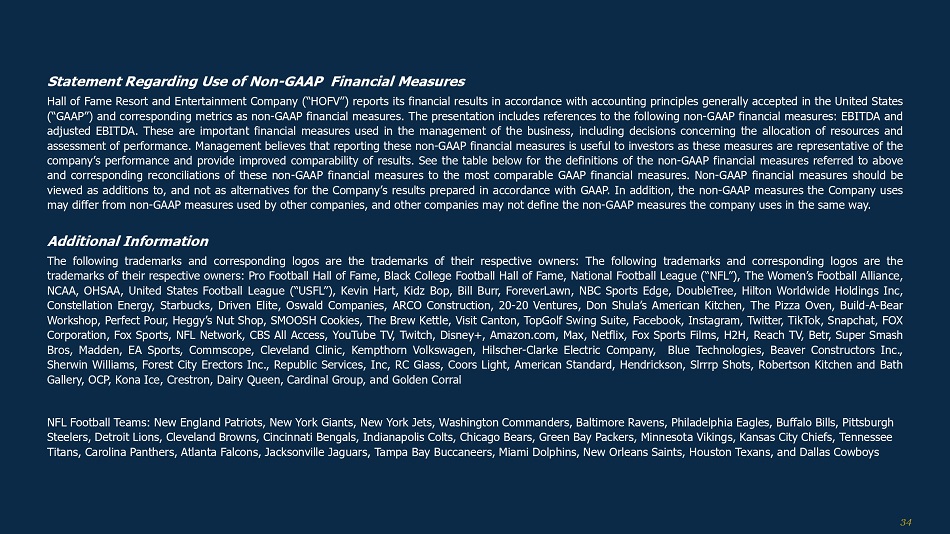关于使用非公认会计原则财务指标的声明Hall of Fame度假村和娱乐公司(“HOFV”)根据美国公认会计原则(“GAAP”)报告其财务结果,并将相应的指标作为非公认会计原则财务指标。该演示文稿引用了以下非GAAP财务指标:EBITDA和调整后EBITDA。这些是企业管理中使用的重要财务措施,包括有关资源分配和业绩评估的决定。管理层认为,报告这些非GAAP财务指标对投资者是有用的,因为这些指标代表了公司的业绩,并提高了业绩的可比性。见下表,上面提到的非GAAP财务指标的定义,以及这些非GAAP财务指标与最具可比性的GAAP财务指标的相应调节。非GAAP财务指标应被视为公司根据GAAP编制的业绩的补充,而不是替代。此外,公司使用的非GAAP衡量标准可能与其他公司使用的非GAAP衡量标准不同,其他公司可能不会以同样的方式定义公司使用的非GAAP衡量标准。附加信息以下商标和相应的商标是它们各自所有者的商标:以下商标和相应的商标是它们各自所有者的商标:职业橄榄球Hall of Fame、黑人大学橄榄球Hall of Fame、国家橄榄球联盟(“NFL”)、女子橄榄球联盟、NCAA、OHSAA、美国橄榄球联盟(“USFL”)、凯文·哈特、Kidz Bop、比尔·伯尔、ForeverLawn、NBC Sports Edge、DoubleTree、希尔顿酒店 Inc、Constellation Energy、星巴克、Driven Elite、Oswald Companies、ARCO Construction、20-20 Ventures、Don Shula’s American Kitchen、The Pizza Oven、Build-A-Bear Workshop,Perfect Pour,Heggy’s Nut Shop,SMOOSH Cookies,The Brew Kettle,Visit Canton,TopGolf Swing Suite,Facebook,Instagram,Twitter,TikTok,Snapchat,FOX Corporation,Fox Sports,NFL Network,CBS All Access,YouTube TV,Twitch,Disney +,Amazon. com,Max,Netflix,Fox Sports Films,H2H,Reach TV,Betr,Super Smash Bros,Madden,EA Sports,Commscope,Cleveland Clinic,Kempthorn Volkswagen,Hilscher-Clarke Electric Company,Blue Technologies,Beaver Constructors Inc.,Sherwin 威廉姆斯,Forest City Erectors Inc.,共和废品处理 Inc.,RC Glass,Coors Light,Dairy Queen、Cardinal Group和Golden Corral NFL球队:新英格兰爱国者队、纽约巨人队、纽约喷气机队、华盛顿指挥官、巴尔的摩乌鸦队、费城老鹰队、布法罗比尔队、匹兹堡钢人队、底特律雄狮队、克利夫兰布朗队、辛辛那提孟加拉虎队、印第安纳波利斯小马队、芝加哥熊队、绿湾包装工队、明尼苏达维京队、堪萨斯城酋长队、田纳西悍将队、卡罗莱纳黑豹队、亚特兰大猎鹰队、杰克逊维尔美洲虎队、坦帕湾海盗队、迈阿密海豚队、新奥尔良圣徒队、休斯顿德州人队和达拉斯牛仔队34