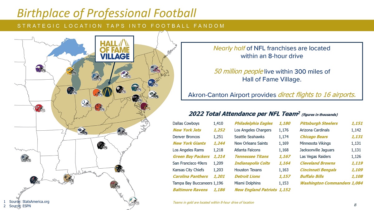 8职业橄榄球诞生地达拉斯牛仔队1,410P hil ade lphi a Eagl e s 1,180 Pit t s bu r g h s t ee l e r s 1,151 New York Jets 1,252 Los Angeles Chargers 1,176 Arizona Cardinals 1,142 Denver Broncos 1,251 Seattle Seahawks 1,174 C hica go B e a r s 1,131 New York Giants1,244新奥尔良圣徒队1,169明尼苏达维京队1,131洛杉矶公羊队1,218亚特兰大猎鹰队1,168杰克逊维尔美洲虎队1,131绿湾包装工队1,214田纳西悍将队1,167拉斯维加斯攻略队1,126旧金山49人队1,209印第安纳队1,209印第安纳队1,209小马队1,164克利夫兰布朗队1,119堪萨斯城酋长队1,203休斯顿德州人队1,163辛辛那提孟加拉虎队1,109美洲板球队1,201底特律雄狮队1,157布法罗比尔队1,108坦帕湾海盗队1,196迈阿密海豚队1,153 Wa s hing ton Co mm ande r s 1,084巴尔的摩乌鸦队1,186 N e w E nglan d Pa t r io1,152 Ne a rly h a lf of NFL f r anchi ses are lo cate d within an 8-h o ur drive 50 m i ll i on people live within 300 miles of Hall of Fame村。阿克伦-坎顿机场提供直达16个机场的航班。2022年美国国家橄榄球联盟第2队总上座率(单位:千人)金牌球队位于距离第1名地点8小时车程范围内来源:StatsAmerica.org 2来源:ESPN