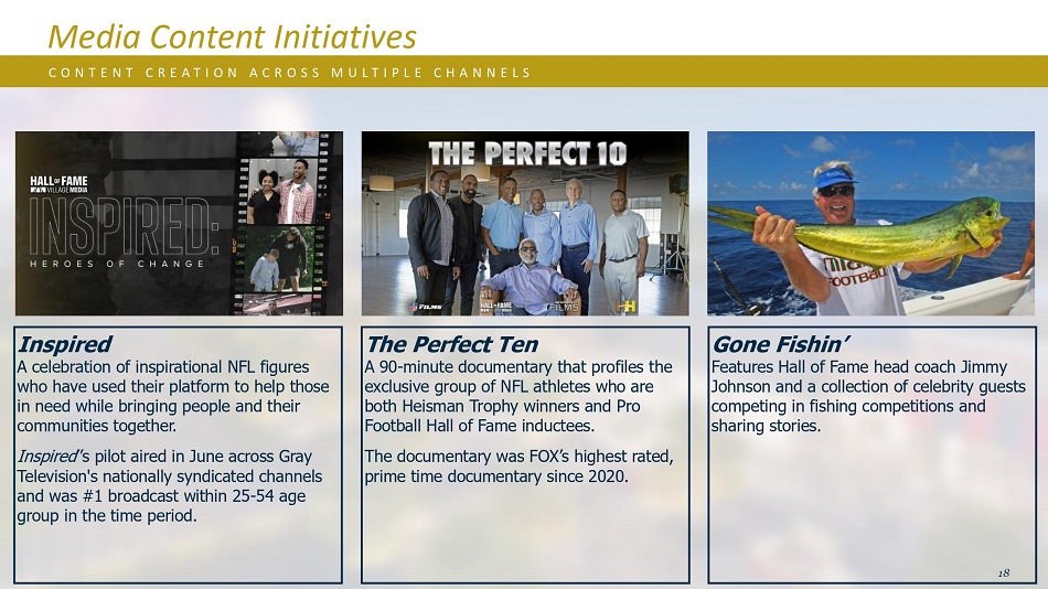 鼓舞人心的美国国家橄榄球联盟鼓舞人心的人物庆祝活动,他们利用自己的平台帮助那些需要帮助的人,同时将人们和他们的社区团结在一起。《Inspired》的试播集于今年6月在格林电视的全国联合频道播出,在25-54岁年龄段的观众中排名第一。媒体内容倡议C O N T E N T C R E A T I O N A C R O S M U L T I P L E C H A N N E L S The Perfect Ten这是一部90分钟的纪录片,讲述了一群NFL运动员的故事,他们既是海斯曼奖杯得主,也是职业橄榄球Hall of Fame入选者。这部纪录片是福克斯自2020年以来收视率最高的黄金时段纪录片。18 Gone Fishin’Features Hall of Fame主教练吉米·约翰逊和一群名人嘉宾在钓鱼比赛中竞争和分享故事。