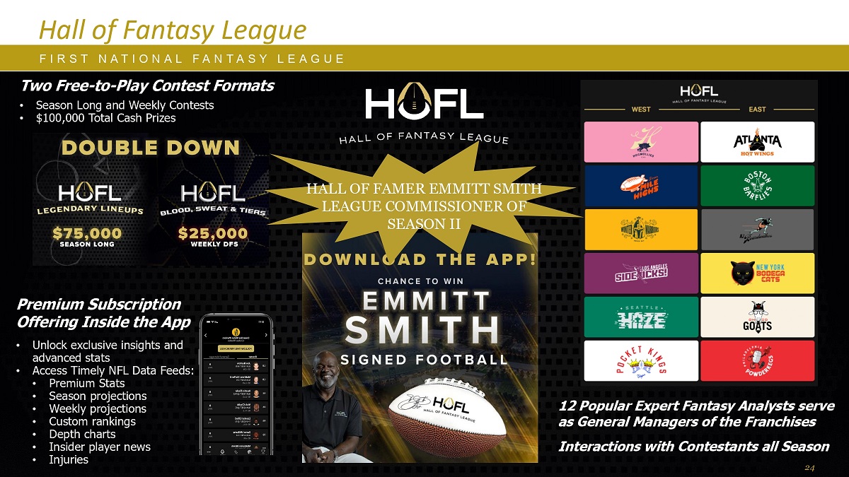 L E A G U E Hall of Fantasy League F I R S T N A T I O N A L F A N T A S Y Two Free to Play Contest Formats • Season Long and Weekly Contests • $ 100,000 Total Cash Prizes HALL OF FAMER EMMITT SMITH LEAGUE COMMISSIONER OF SEASON II 12 Popular Expert Fantasy Analysts serves as General Managers of the Franchises Interactions with Contestants All Season Premium Subscription Offering Inside the App • Unlock Exclusive Insights和高级数据•及时访问NFL数据馈送:•高级数据•赛季预测•每周预测•自定义排名•深度图表•内部球员新闻•伤病24