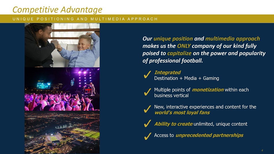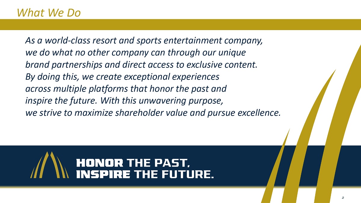 2我们做什么作为一家世界级的度假和体育娱乐公司,我们通过独特的品牌合作伙伴关系和直接获取独家内容,做其他公司无法做到的事情。通过这样做,我们在多个平台上创造了非凡的体验,向过去致敬,激励未来。本着这一坚定不移的目标,我们努力实现股东价值最大化,追求卓越。