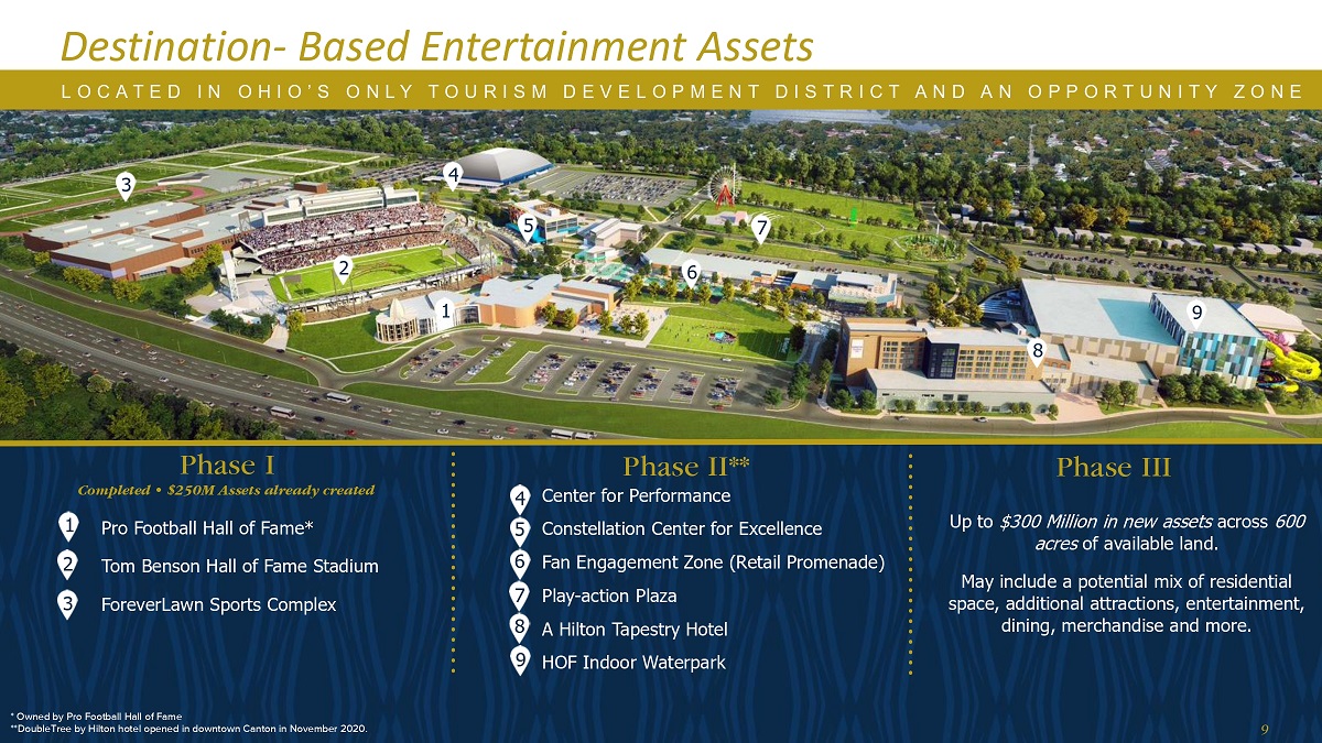 第三阶段高达3亿美元的新资产,分布在600英亩的可用土地上。可能包括住宅空间、额外的景点、娱乐、餐饮、商品等等的潜在组合。*归职业足球Hall of Fame所有* *希尔顿逸林酒店于2020年11月在广州市中心开业。1个职业足球Hall of Fame * 2个汤姆·本森Hall of Fame体育场3个ForeverLawn运动综合设施一期已完工• 2.5亿美元资产已建成二期* * 4个表演中心5个星座中心For Excellence 6 Fan Engagement Zone(Retail Promenade)7 Play-Action Plaza 8 A Hilton Tapestry Hotel 9 HOF Indoor Waterpark 9 Destination-Based Entertainment Assets L O C A T E D I N O H I O O O I O O O H I O’S O N L Y T O U R I S M D E V E L O P M E N T D I S T R I C T A N D A N O P P O R T U N I T Y Z O N E 12354789 6
