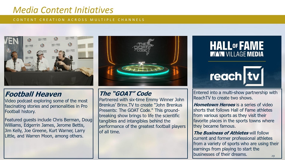 足球天堂视频播客探索一些最有趣的故事和人物在职业足球史上。特邀嘉宾包括Chris Berman,Doug Williams,Edgerrin James,Jerome Bettis,Jim Kelly,Joe Greene,Kurt Warner,Larry Little和Warren Moon等。媒体内容倡议C O N T E N T C R E A T I O N A C R O S M U L T I P L E C H A N N E L S 19 The“GOAT”Code与六届艾美奖得主John Brenkus的Brinx.TV合作创作了《John Brenkus Presents:The GOAT Code》。这场开创性的表演让有史以来最伟大的足球运动员的表现背后的科学有形和无形的东西栩栩如生。与ReachTV达成多档节目合作,打造两档节目。《家乡英雄》是一系列视频短片,讲述来自不同体育项目的Hall of Fame运动员在他们成名的体育小镇参观他们最喜欢的地方。The Business of Athletes将关注来自各种体育项目的现任和前任职业运动员,他们将利用自己的比赛收入创办自己梦想中的事业。
