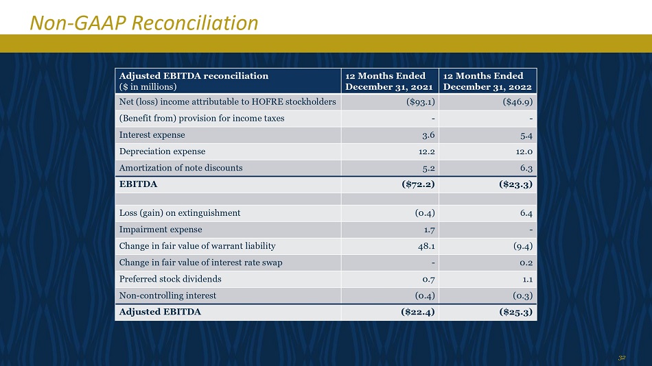 非公认会计原则调节32调整后的EBITDA调节(百万美元)截至2021年12月31日的12个月截至12月31日的12个月,2022年归属于HOFRE股东的净(亏损)收入(93.1美元)(46.9美元)(受益于)所得税准备金--利息支出3.65.4折旧支出12.21 2.0票据贴现摊销5.26.3 EBITDA(72.2美元)(23.3美元)终止损失(收益)(0.4)6.4减值支出1.7-认股权证负债公允价值变动48.1(9.4)利率掉期公允价值变动-0.2优先股股息0.7 1.1非控股权益(0.4)(0.3)调整后EBITDA(22.4美元)(25.3美元)