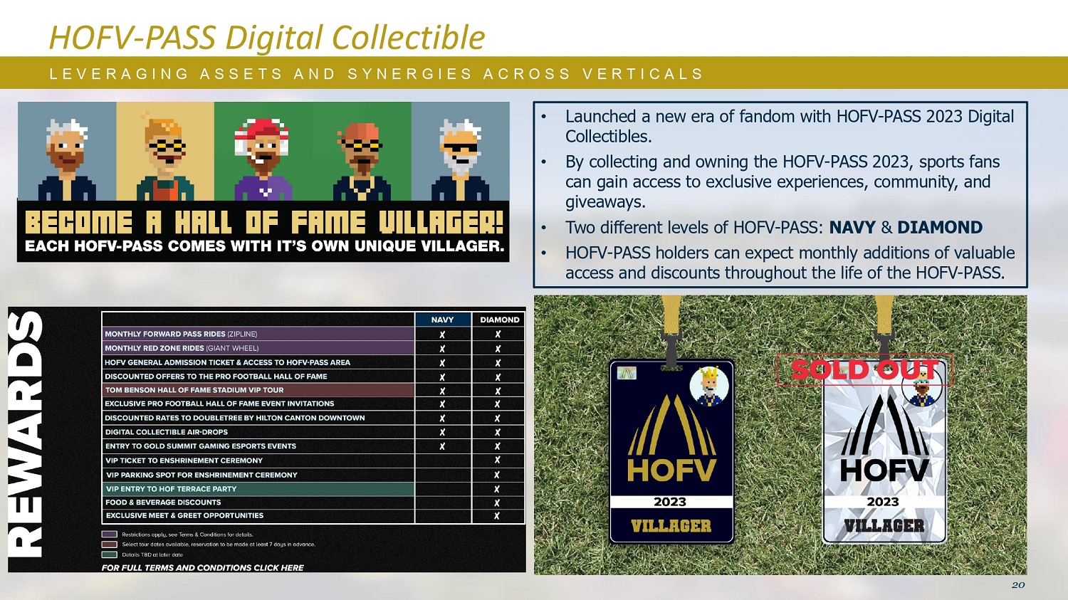HOFV-PASS数字收藏品L E V E R A G I N G A S E T S A N D S Y N E R G I E E S A C R O S S V E R T I C A L S 20 •推出HOFV-PASS 2023数字收藏品的粉丝新时代。•通过收藏和拥有HOFV-PASS 2023,体育爱好者可以获得独家体验、社区和赠品。•两个不同级别的HOFV-通行证:NAVY和钻石• HOFV-通行证持有者可以期望在HOFV-通行证的整个有效期内每月增加有价值的准入和折扣。