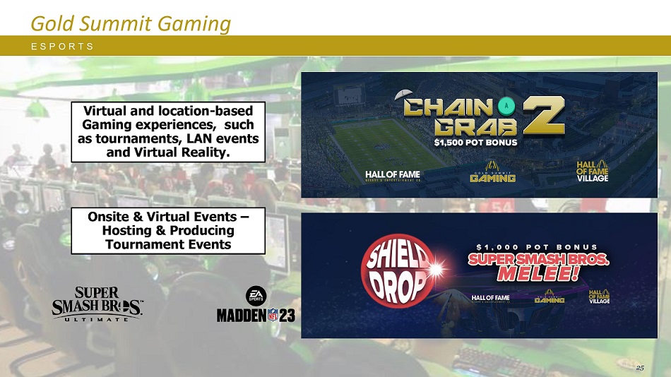 E S P O R T S Gold Summit Gaming虚拟和基于位置的游戏体验,如锦标赛、局域网活动和虚拟现实。现场和虚拟活动–主办和制作锦标赛活动25