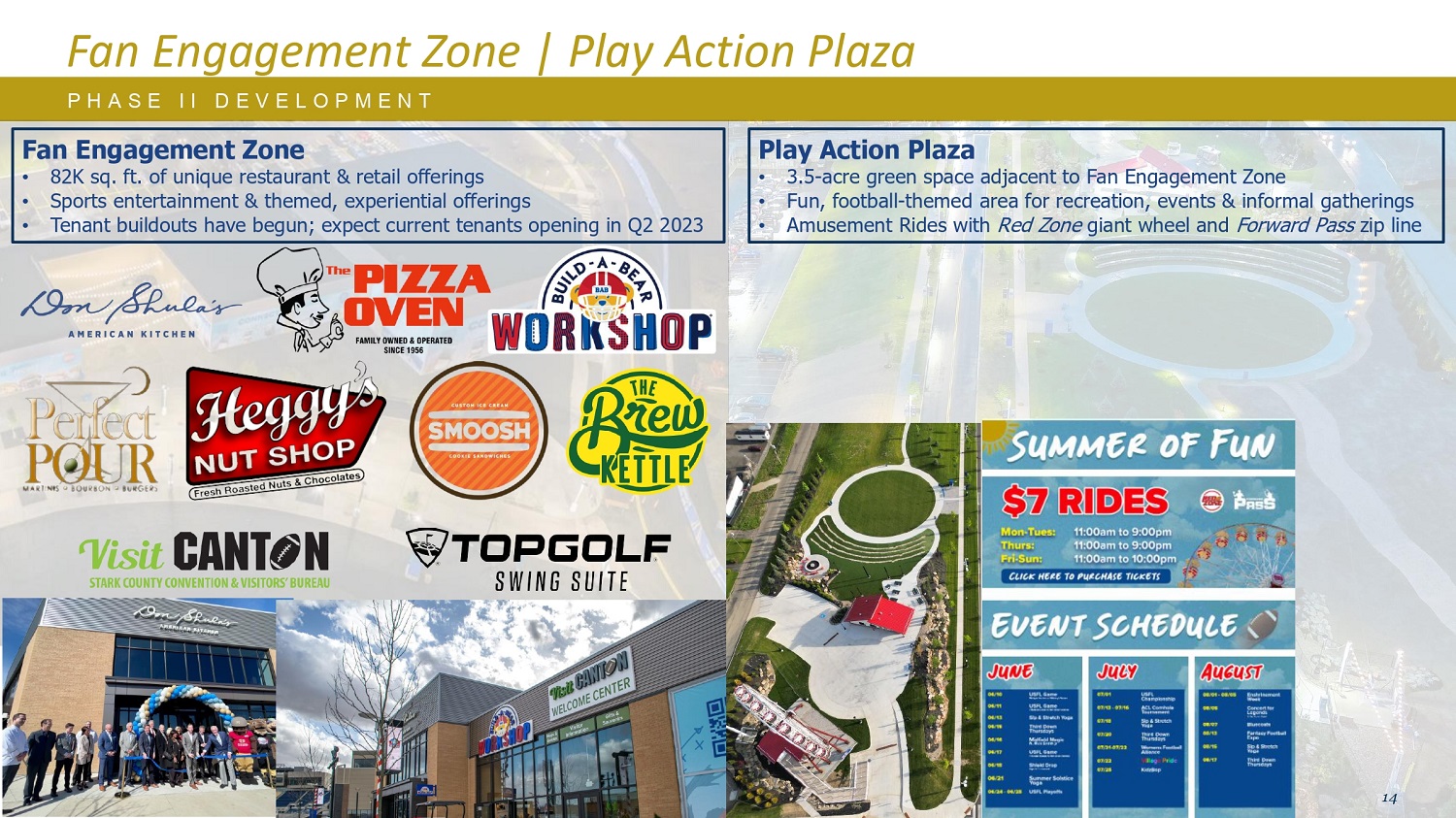 P H A S E I I I D E V E L O P M E N T Fan Engagement Zone | Play Action Plaza Fan Engagement Zone • 82K sq. ft. of unique restaurant & retail offerings • Sports entertainment & themed,experiential offerings •租户扩建工程已经开始;预计当前租户将于2023年第二季度开业Play Action Plaza • 3.5英亩的绿地毗邻Fan Engagement Zone • Fun,Football theme area for recreation,events & informal gatherings • Amusement Rides with Red Zone giant wheel and Forward P