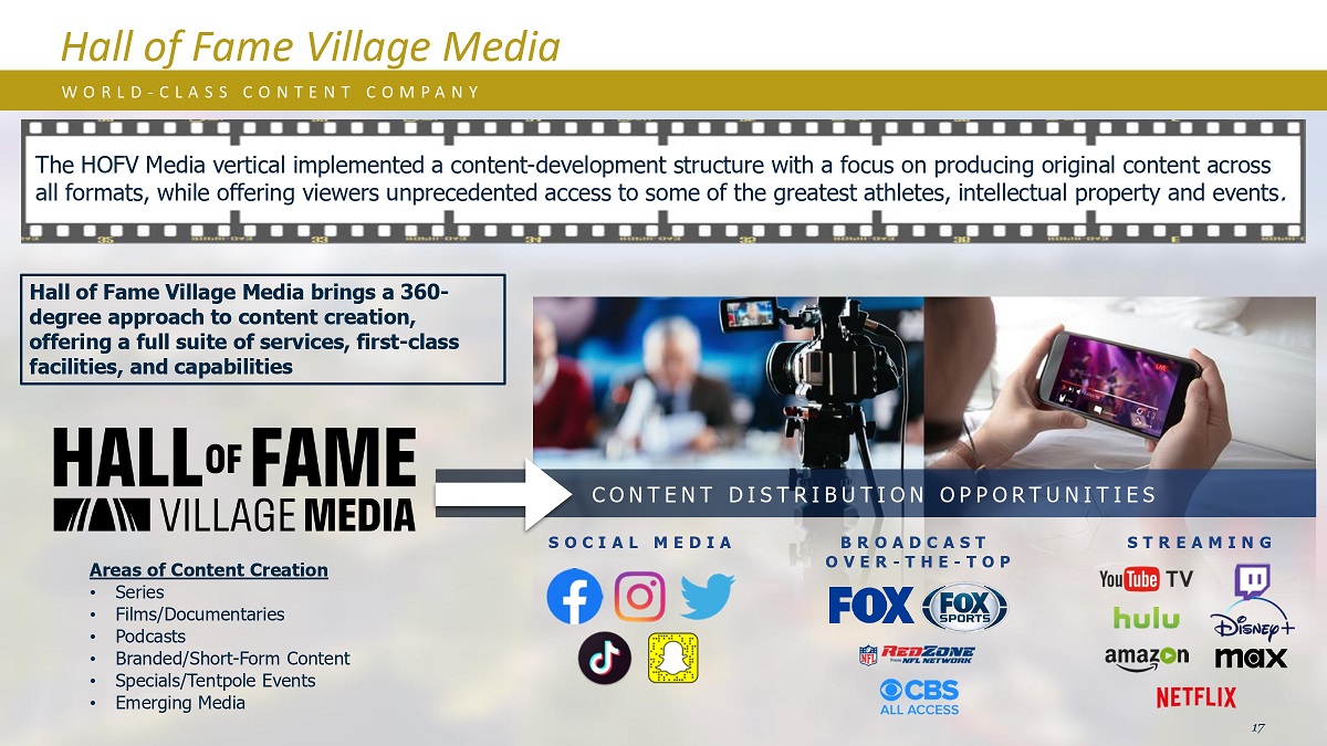 Hall of Fame村媒体W O R L D-C L A S S C O N T E N T C O M P A N Y C O N T E N T D I S T R I B U T I O N O P P O R T U N I T I E S O C I A L M E D I A The HOFV Media vertical implements a content-development structure,focusing on producing original content across all forms,同时为观众提供前所未有的机会,让他们了解一些最伟大的运动员、知识产权和赛事。内容创作领域•系列•电影/纪录片•播客•品牌/短篇内容•特别/天平活动•新兴媒体B R O A D C A S T S T R E A M I N G O V E R-T H E-T O P Hall of Fame乡村媒体公司带来了360度的内容创作方法,提供全套服务、一流的设施和能力17