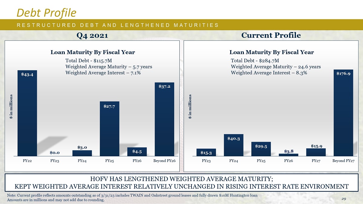 29 R E S T R U C T U R E D债务简介40美元。3 $29 .5 $ 3.8 $ 1 5 .9 $ 1 76 .9 $ 1 5 .3 FY23 FY 24 FY 25 FY 26 FY 27 Beyond FY27百万美元43。4 $ 3.0 $27 .7 $4 .5 $ 3 7 .22财年0美元。0 FY23 FY 24 FY 25 FY 26 Beyond FY26百万美元D E B T A N D L E N G T H E N E D M A T U R I T I E S Q4 2021 Current Profile Loan Maturity By Fiscal Year Total Debt-$ 1.157亿Weighted Average Maturity – 5.7年Weighted Average Interest – 7.1% Loan Maturity By Fiscal Year Total Debt-$ 2.847亿Weighted Average Maturity – 24.6年Weighted Average Interest Relatively Unchanged in RISING Interest利率环境注:当前概况反映了截至23年3月31日的未偿还金额,包括TWAIN和Oakstreet土地租赁和全额提取的1000万美元亨廷顿贷款金额以百万计,由于四舍五入,可能不会相加。