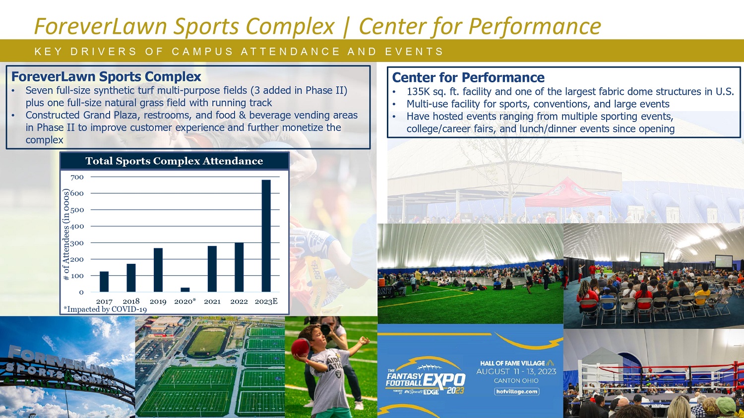 K E Y D R I V E R S O F C A M P U S A T T E N D A N C E A N D E V E N T S ForeverLawn Sports Complex | Center参观者表现#(千人)综合运动场总参观量70060050040030020010002017201820192020 * 202120222023E *受COVID影响-19 ForeverLawn综合运动场•七个全尺寸人造草坪多用途运动场(二期新增3个)加上一个带跑道的全尺寸天然草场•已建成的大广场,洗手间,以及二期的食品和饮料销售区,以改善客户体验,并进一步将复杂的表演中心货币化。135000平方英尺的设施和美国最大的织物穹顶结构之一•多用途设施,用于体育、会议和大型活动•自开业以来,举办过多项体育活动、大学/职业博览会和午餐/晚餐活动等活动1212