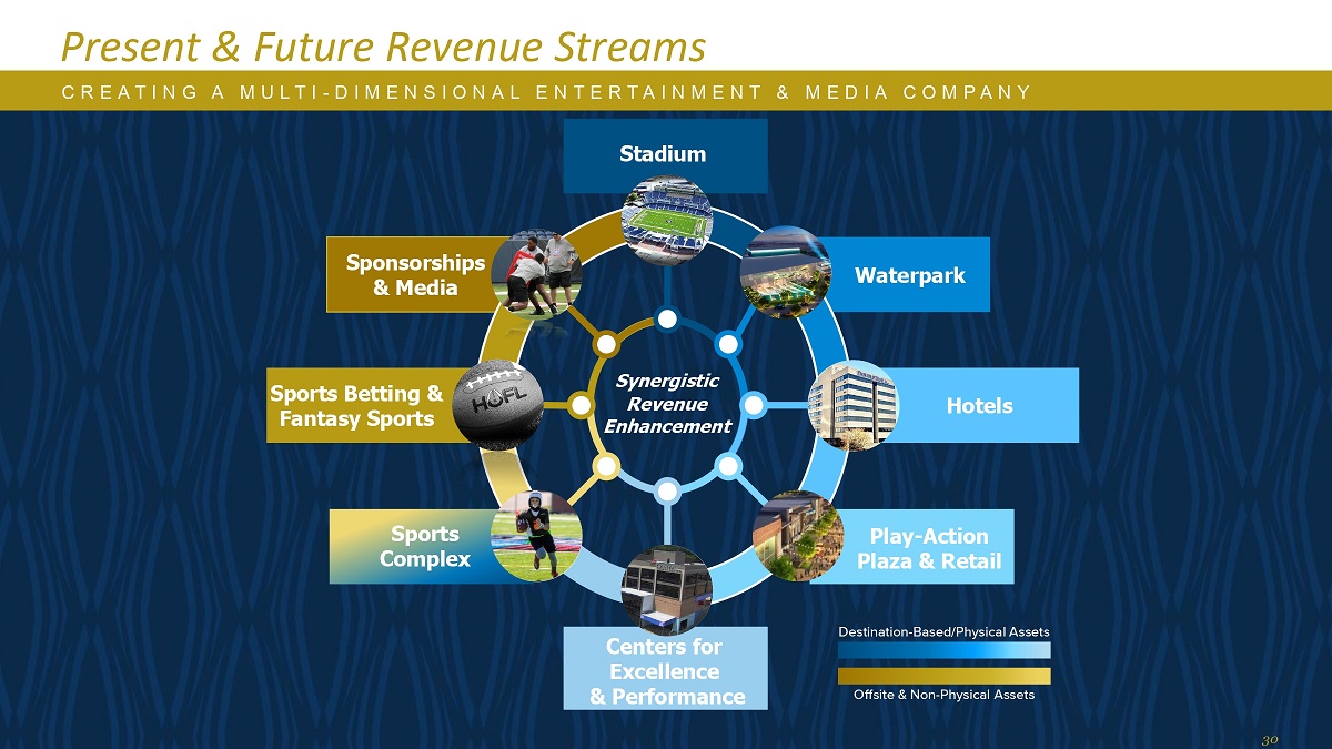 Present & Future Revenue Streams D es t in a t i o n-Based/P hys ical A ss et s O ff si t e & N on-P hys ical A ss et s Synergistic Revenue Enhancement C R E A T I N G A M U L T I-D I M E N S I O N A L E N T E R T A I N M E N T & M E D I A C O M P A N Y Stadium Waterpark H o te ls Play-Action Plaza & Retail Sp o r t s Compl e x Centers for Excellence & Performance Sports博彩和梦幻体育赞助与媒体30