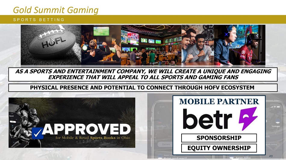 Gold Summit Gaming S P O R T S B E T T I N G PHYSICAL PRESENCE AND POTENTIAL TO CONNECT THROUGH HOFV ECOSYSTEM As a SPORTS AND ENTERTAINMENT COMPANY,WE WILL CREATE A UNIQUE AND ENGAGING EXPERIEENCE THAT WILL APPEAL TO ALL SPORTS AND GAMING FANS MOBILE PARTNER SPONSORSHIP EQUITY OWNERSHIP 23