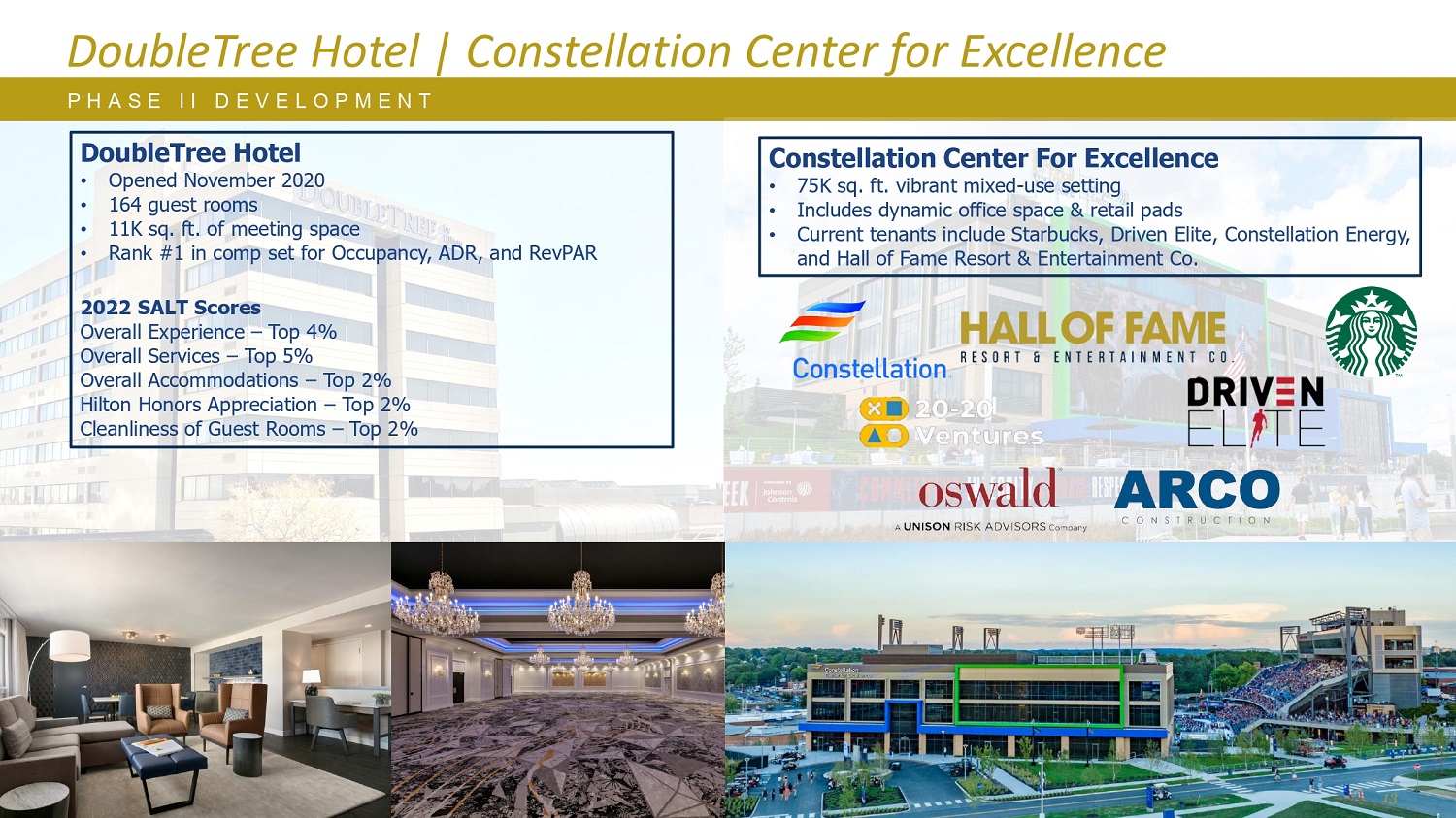 DoubleTree酒店| Constellation Center for Excellence P H A S E I I I I D E V E L O P M E N T DoubleTree酒店• 2020年11月开业• 164间客房• 11K平方英尺的会议空间•在入住率、ADR、和RevPAR2022 SALT评分整体体验–前4%的整体服务–前5%的整体住宿–前2%的希尔顿荣誉客会赞赏–前2%的客房清洁度–前2%的星座卓越中心• 75K平方英尺的充满活力的混合用途环境•包括充满活力的办公空间和零售平台•目前的租户包括星巴克、Driven Elite、Constellation Energy和Hall of Fame度假村和娱乐公司。13