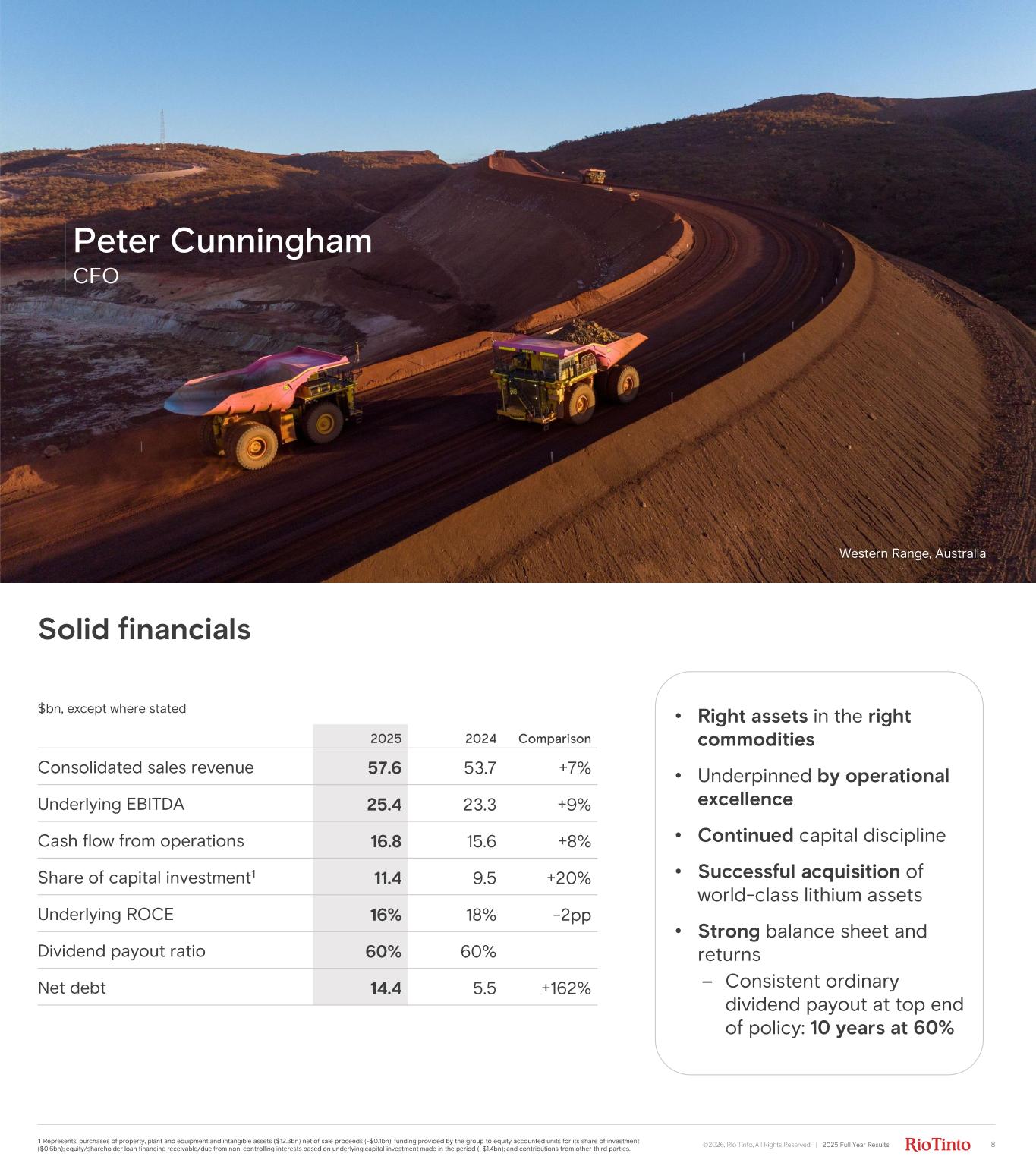 澳大利亚Western Range Peter Cunningham CFO Solid Financial 81代表:购买物业、厂房和设备以及无形资产(123亿美元),扣除出售收益(-1亿美元);集团向股权提供的资金p占其投资份额的单位(6亿美元);基于该期间进行的基础资本投资的应收/应收非控股权益的股权/股东贷款融资(-14亿美元);以及来自其他第三方的出资。•合适的商品中的合适资产•以卓越运营为支撑•持续的资本纪律•成功收购世界级的锂资产•强劲的资产负债表和回报–政策高端始终如一的普通股息支付:10年60%©2026年,力拓,版权所有| 2025年全年业绩20252024年比较合并销售收入57.65 3.7 + 7%基本EBITDA 25.42 3.3 + 9%经营现金流16.81 5.6 + 8%资本投资份额111.49.5 + 20%基本ROCE 16% 18%-2pp派息率60% 60%净债务14.45.5 + 162% $ bn,除非另有说明