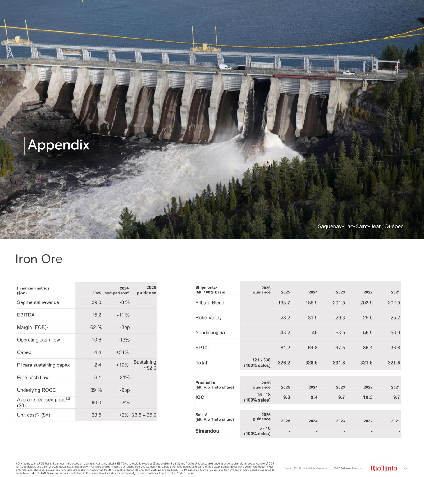 Saguenay – LAC-Saint-Jean,Qu é bec附录出货量3(公吨,100%基础)2026指导20252024202320222021 Pilbara Blend 193.7185.9 201.5 203.9202.9 Robe Valley 28.23 1.92 9.325.5 25.2 Yandicoogina 43.24653.556.9 56.9 SP10 61.26 4.847.5 35.4 36.6总计323-338(100%销售额)326.23 28.63 31.83 21.63 21.6产量(公吨,力拓份额)2026指导20252024202320222021 IOC 15-18(100%销售额)9.39.49.7 10.39.7销售额5(公吨,力拓份额)2026年指导意见20252024202320222021西芒杜5-10(100%销售)------1干公吨,离岸价基础。2单位成本基于EBITDA中包含的运营成本,不包括特许权使用费(国家和第三方)和运费。Unit COSTS以2025年实际值0.64和2026年指导值0.67的澳元汇率表示。仅3个皮尔巴拉。4所有数字均反映Pilbara业务、加拿大铁矿石公司、Portside贸易和Dampier Salt,2024年的比较数据已重述,以反映组织变化。5 S曼杜矿门2025年产量为1.0公吨(湿公吨,RT份额)。2026年,我们以100%的销量为基础,指导5 – 10吨。铁矿石总销量(100%基差)预计在343-366mt之间。西芒杜不包括在上述财务指标中,正如目前在铁矿石产品组之外报告的那样。财务指标(十亿美元)2025-2024年对比42026年指引分部收入29.0-8 % EBITDA 15.2-11 %利润率(离岸价)362%-3pp经营现金流10.6-13 %资本支出4.4 + 34%皮尔巴拉维持资本支出2.4 + 19%维持~2.0美元自由现金流6.1-31 %基础ROCE 39%-9pp平均实现价格1,3($/t)90.0-8 %单位成本2,3($/t)23.5 + 2% 23.5 – 25.0©2026,力拓,版权所有| 2025年全年业绩22铁矿石