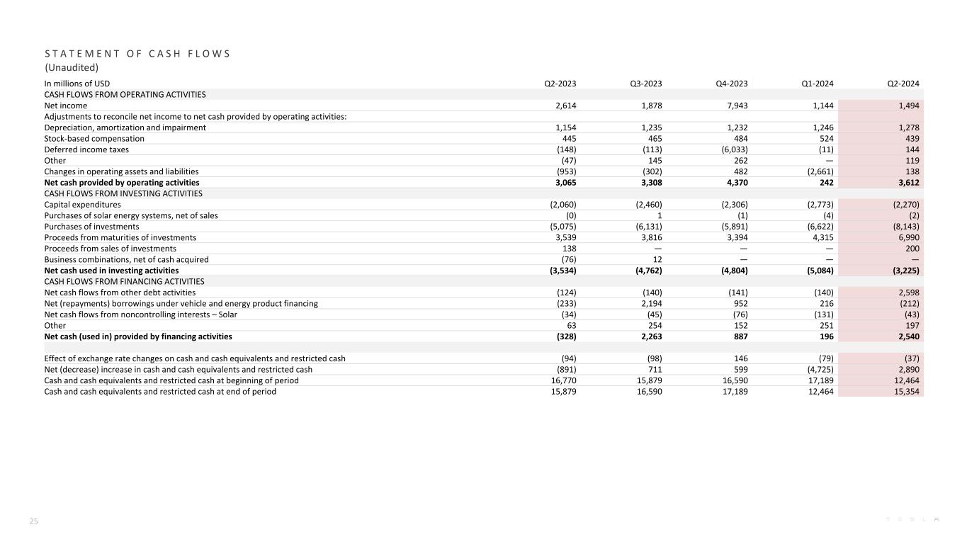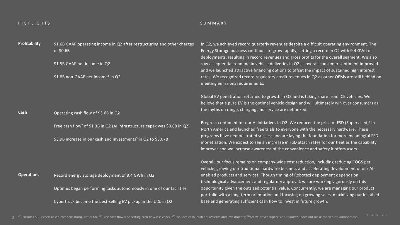 S U M M A R YH I G H L I G H T S(1)不包括SBC(基于股票的薪酬),税后净额;(2)自由现金流=经营现金流减去资本支出;(3)包括现金、现金等价物和投资;(4)需要积极的驾驶员监督;不会使车辆自动驾驶。盈利能力$ 1.6B GAAP营业收入Q2扣除重组和其他费用后$ 0.6B $ 1.5B GAAP净收入Q2 $ 1.8B non-GAAP净收入1 Q2,尽管经营环境艰难,我们仍实现了创纪录的季度收入。储能业务继续高速增长,Q2以9.4GWh的部署量创下历史纪录,导致整体板块的收入和毛利均创历史新高。我们还看到第二季度汽车交付量出现连续反弹,因为整体消费者情绪有所改善,我们推出了有吸引力的融资方案以抵消持续高利率的影响。由于其他原始设备制造商在满足排放要求方面仍然落后,我们在第二季度确认了创纪录的监管信贷收入。全球电动汽车渗透率在第二季度恢复增长,并正在从ICE汽车中抢占份额。我们认为,随着续航里程、充电和服务的神话被揭穿,纯EV是最优的车辆设计,最终将赢得消费者的青睐。我们的人工智能计划在第二季度继续取得进展。我们在北美降低了FSD(Supervised)4的价格,并推出了免费试用给所有人,配备了必要的硬件。这些计划已经证明是成功的,并正在为更有意义的FSD货币化奠定基础。随着能力的提高以及我们提高对其为用户提供的便利性和安全性的认识,我们预计我们的车队的FSD附加率将会增加。总体而言,我们的重点仍然是降低全公司的成本,包括降低每辆车的COGS、发展我们的传统硬件业务以及加速开发我们的人工智能产品和服务。尽管Robotaxi的部署时间取决于技术进步和监管批准,但鉴于巨大的潜在价值,我们正在大力利用这一机会。同时,我们正在以长期为导向管理我们的产品组合,并专注于不断增长的销售,最大限度地扩大我们的安装基础,并产生足够的现金流,以投资于未来的增长。第二季度现金运营现金流3.6B美元自由现金流2第二季度1.3B美元(第二季度AI基础设施资本支出为0.6B美元)第二季度现金和投资增加3.9B美元3至30.7B美元运营创纪录的储能部署第二季度9.4GWh Optimus开始在我们的一个设施中自主执行任务Cybertruck成为第二季度美国最畅销的电动皮卡3