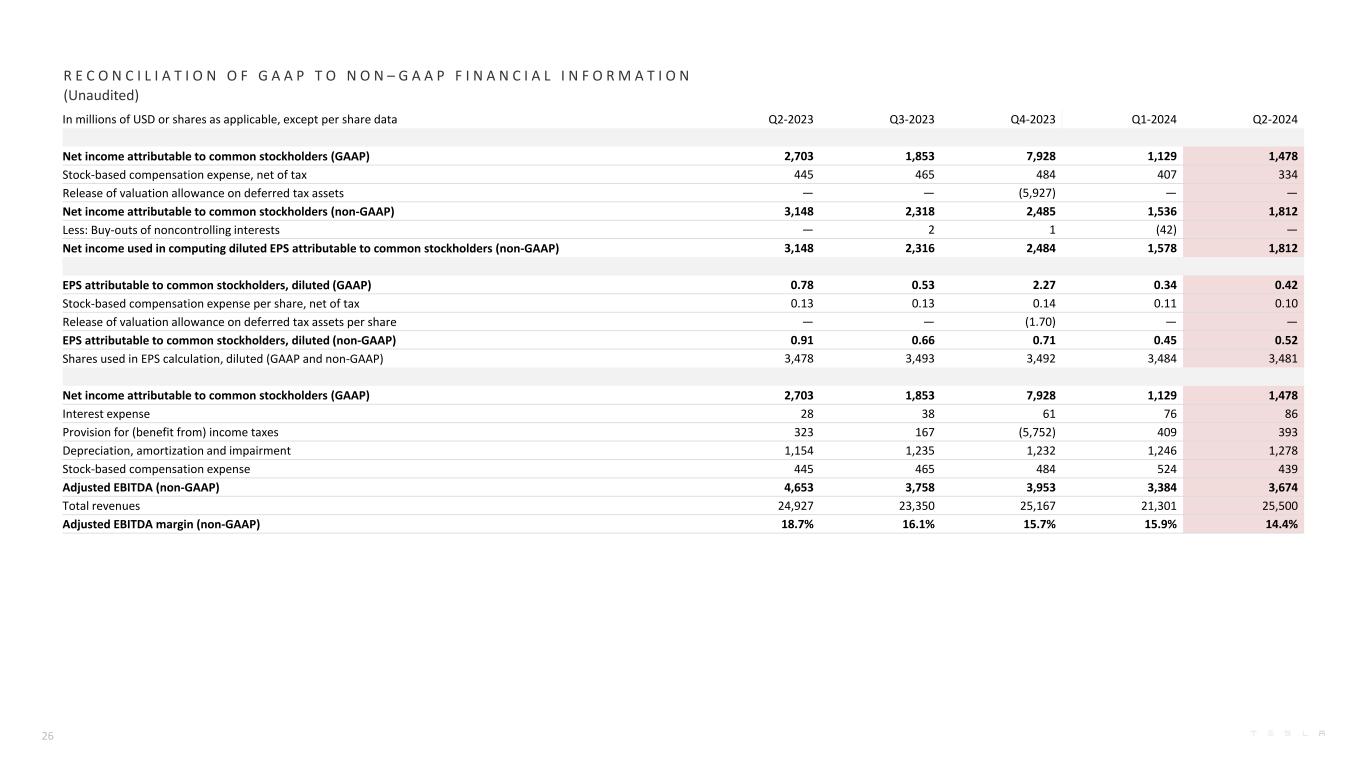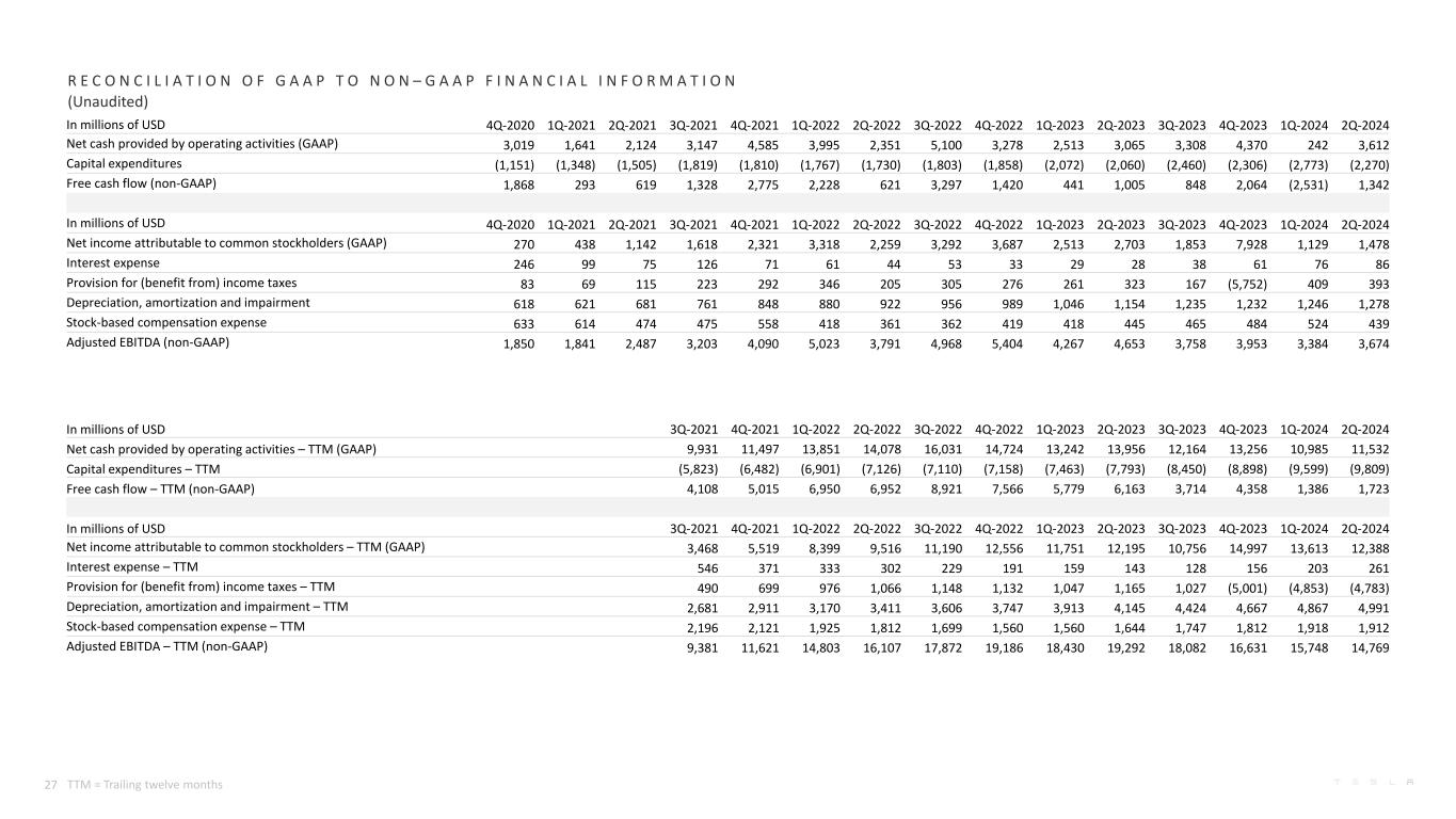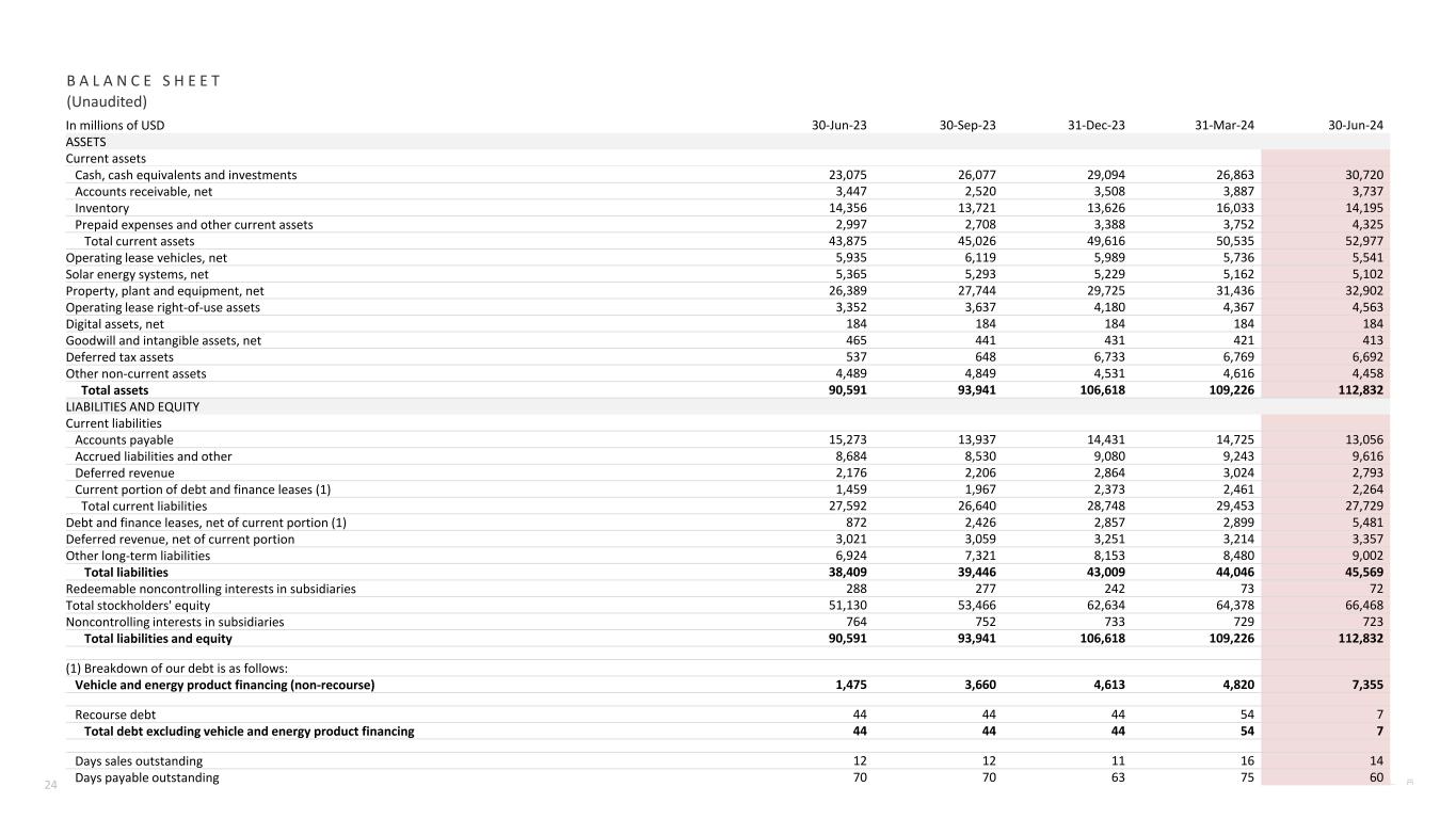 A D D I T I O N A L I N F O R M A T I O N网络广播信息特斯拉将于2024年7月23日美国东部时间下午4:30在ir.tesla.com提供2024年第二季度财务业绩电话会议的网络直播。这一网络广播也将在此后大约一年内可供重播。某些术语在此更新中使用时,某些术语具有以下含义。我们的车辆交付仅包括已转让给最终客户并正确完成所有文书工作的车辆。我们的能源产品部署量既包括安装时的客户单位,也包括交付时的设备销售。“调整后EBITDA”等于(i)在(ii)(a)利息支出、(b)所得税准备金、(c)折旧、摊销和减值以及(d)基于股票的补偿费用之前归属于普通股股东的净收入(亏损)。“自由现金流”是经营现金流减去资本支出。每辆车的平均成本是汽车销售成本除以新车交付(不包括经营租赁)。“未完成销售天数”等于(i)平均应收账款,期间净额除以(ii)总收入,再乘以(iii)期间天数。“未偿应付天数”等于(i)该期间的平均应付账款除以(ii)总收入成本,再乘以(iii)该期间的天数。“供应天数”的计算方法是将新车期末库存除以相关季度的交付量,并使用75个交易日。不变货币影响的计算方法是将实际值与当前结果进行比较,使用上一期间的平均汇率换算成美元。非公认会计原则财务信息合并财务信息已根据公认会计原则以及非公认会计原则基础呈报,以补充我们的合并财务业绩。我们的非GAAP财务指标包括非GAAP归属于普通股股东的净收入(亏损)、非GAAP归属于普通股股东的稀释每股净收入(亏损)(使用加权平均股份计算的GAAP归属于普通股股东的稀释净收入(亏损))、调整后EBITDA、调整后EBITDA利润率和自由现金流。这些非公认会计准则财务指标也有助于管理层与特斯拉的历史业绩进行内部比较,以及与其他公司的经营业绩进行比较。管理层认为,用这些非GAAP信息补充其GAAP财务报表是有用的,因为管理层在内部将这些信息用于其运营、预算编制和财务规划目的。管理层还认为,非公认会计准则财务指标的列报为我们的投资者提供了有关我们的财务状况和经营业绩的有用信息,以便投资者能够通过特斯拉管理层的眼睛看到特斯拉用来经营业务的重要财务指标,并让投资者更好地了解特斯拉的业绩。非GAAP信息不是根据一套全面的会计规则编制的,因此,在了解特斯拉的经营业绩时,只能与根据美国公认会计原则报告的财务信息一起阅读。上面提供了GAAP和非GAAP财务信息之间的对账。前瞻性陈述本次更新中的某些陈述,包括“展望”部分的陈述;与未来发展、战略、坡道、生产和产能、需求和市场增长、成本、定价和盈利能力、投资、交付、部署、可用性和其他特性以及现有和未来特斯拉产品和服务的改进和时间安排有关的陈述;与营业利润率、营业利润、支出和流动性有关的陈述;与我们工厂的扩张、改进和/或坡道以及相关时间安排有关的陈述均为“前瞻性陈述”,存在风险和不确定性。这些前瞻性陈述是基于管理层当前的预期,由于某些风险和不确定性,实际结果可能与预测的结果存在重大差异。以下重要因素,但不限于,可能导致实际结果与前瞻性陈述中的结果存在重大差异:延迟推出和制造我们的产品和功能的风险——具有成本效益;我们提高销售、交付、安装、服务和充电能力并有效管理这种增长的能力;消费者对电动汽车的总体需求,特别是我们的车辆;供应商根据我们可接受的时间表、价格、质量和数量交付组件的能力, 以及我们有效管理此类组件的能力;我们工厂制造的锂离子电池或其他组件的任何问题;我们按照我们的计划提升工厂的能力;我们采购电池供应的能力,包括通过我们自己的制造;与国际扩张有关的风险;特斯拉产品未能按预期表现或如果发生产品召回;产品责任索赔的风险;汽车和能源产品市场的竞争;我们维持公众信誉和对我们长期业务前景的信心的能力;我们管理与我们的各种产品融资计划相关的风险的能力;电动汽车和能源产品的政府和经济激励措施的状况;我们吸引、雇用和留住关键员工和合格人员;我们维护我们的信息和生产及产品系统安全的能力;我们遵守适用于我们的运营和产品的各种法规和法律,这些法规和法律可能会不时演变;与我们的债务和融资策略相关的风险;以及不利的外汇走势。有关可能影响我们财务业绩的潜在因素的更多信息不时包含在我们的证券交易委员会文件和报告中,包括我们于2024年1月26日向SEC提交的10-K表格年度报告中标题为“风险因素”部分下确定的风险。无论是由于新信息、未来事件或其他原因,特斯拉均不承担更新这些前瞻性陈述中包含的信息的任何义务。28